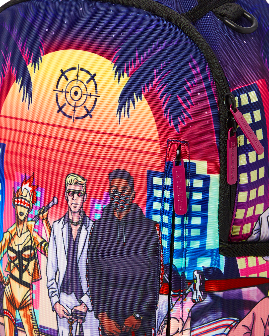 ExteriorDimensions: 18" x 6" x 11.5" ∙ Front zipper pocket ∙ Side pockets ∙ Zippered Stash pocket ∙ Ergonomic mesh back padding ∙ Adjustable Straps for custom sizing ∙ Nylon Zippers with Metal Hardware ∙ Metal "Sprayground Authentic" badge ∙ Slide through back sleeve connects to Carry on luggage to free your hands