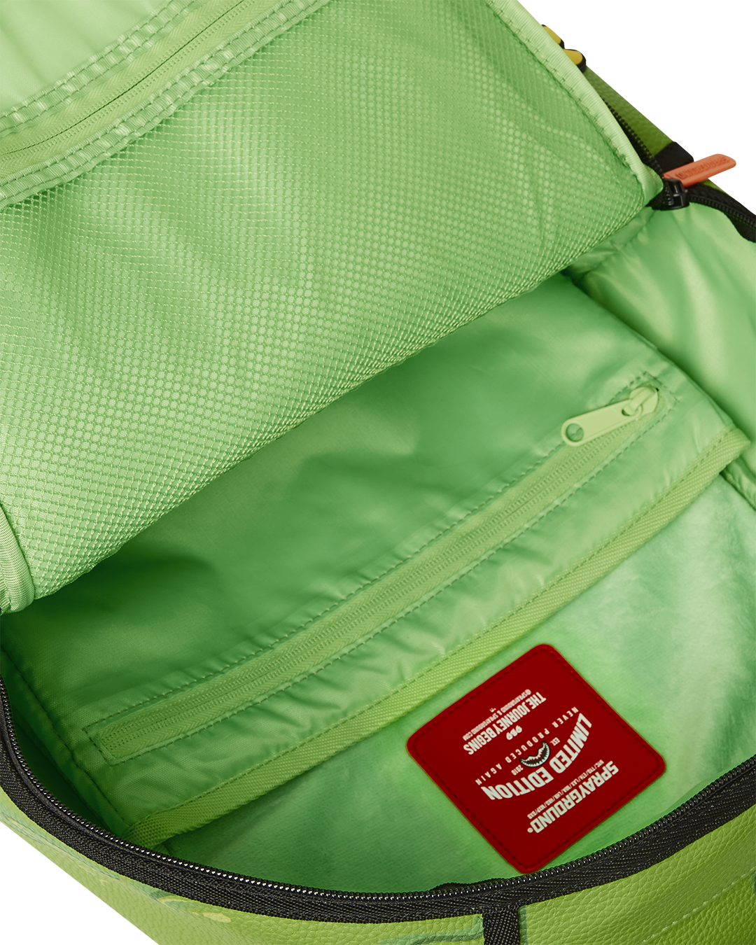Dimensions: 18" x 6" x 11.5" • Front zipper pocket • Side pockets • Zippered Stash pocket • Separate velour sunglass compartment • Ergonomic mesh back padding • Adjustable Straps for custom sizing • Gold zippers with metal hardware • Metal "Sprayground Authentic" badge • Slide through back sleeve connects to carry-on luggage to free your hands