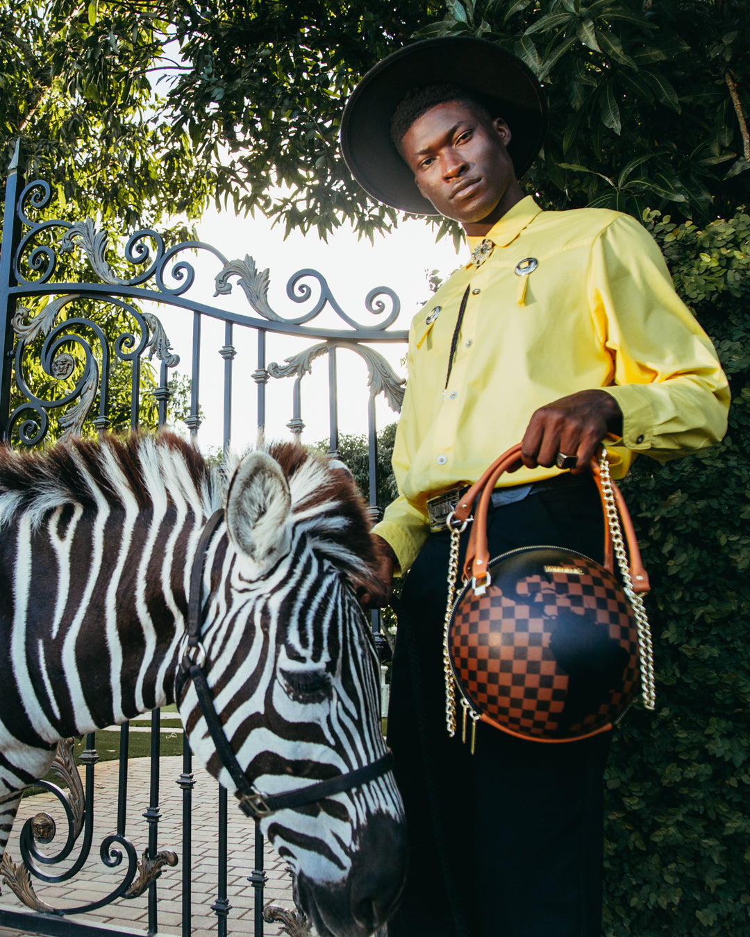 Whimsical sphere-shaped shoulder bag features sharks in Paris map printed in saffiano fabric with contrast cognac pebble fabric
