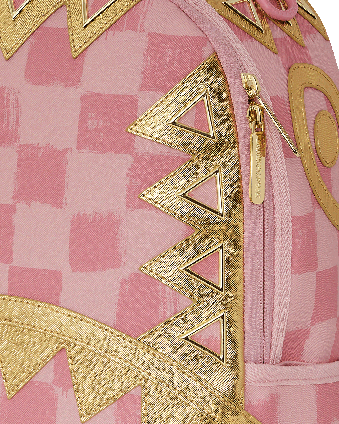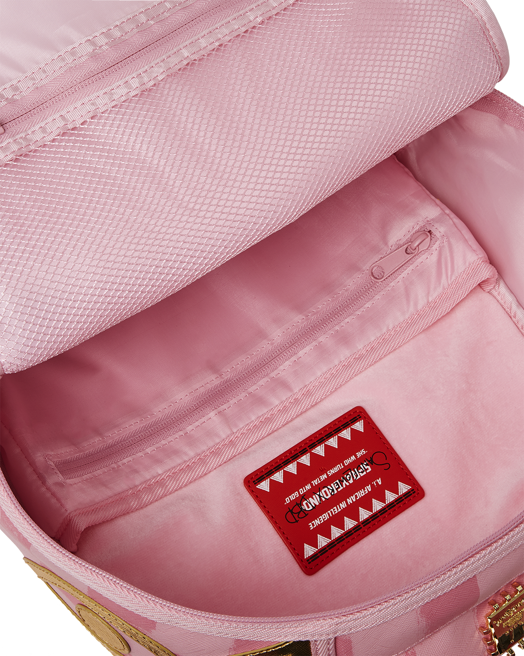 Dimensions: 18" x 6" x 11.5" • Front zipper pocket • Side pockets • Zippered Stash pocket • Separate velour sunglass compartment • Ergonomic mesh back padding • Adjustable Straps for custom sizing • Gold zippers with metal hardware • Metal "Sprayground Authentic" badge • Slide through back sleeve connects to carry-on luggage to free your hands