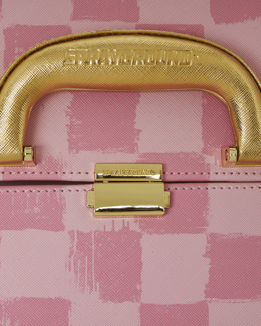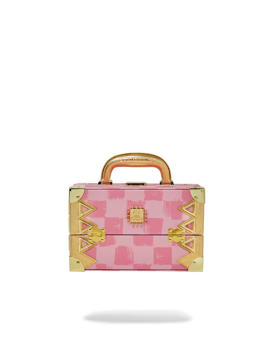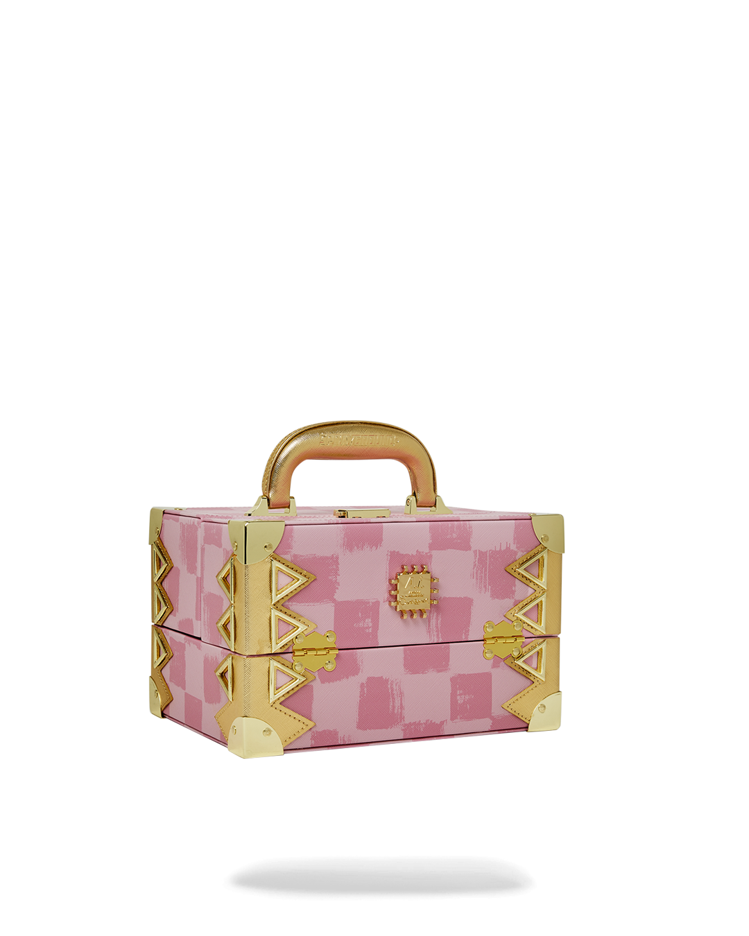 Pink velour lining, Tiered shelving, removable tray, interior mirror.