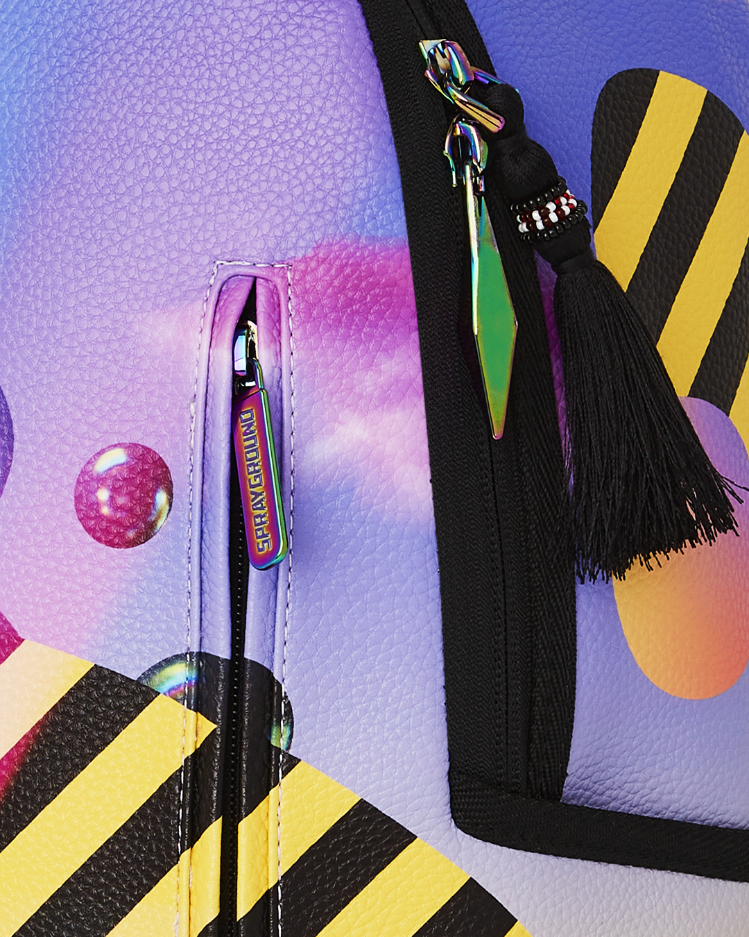 Dimensions: 18" x 6" x 11.5" • Front zipper pocket • Side pockets • Zippered Stash pocket • Separate velour sunglass compartment • Ergonomic mesh back padding • Adjustable Straps for custom sizing • Gold zippers with metal hardware • Metal "Sprayground Authentic" badge • Slide through back sleeve connects to carry-on luggage to free your hands