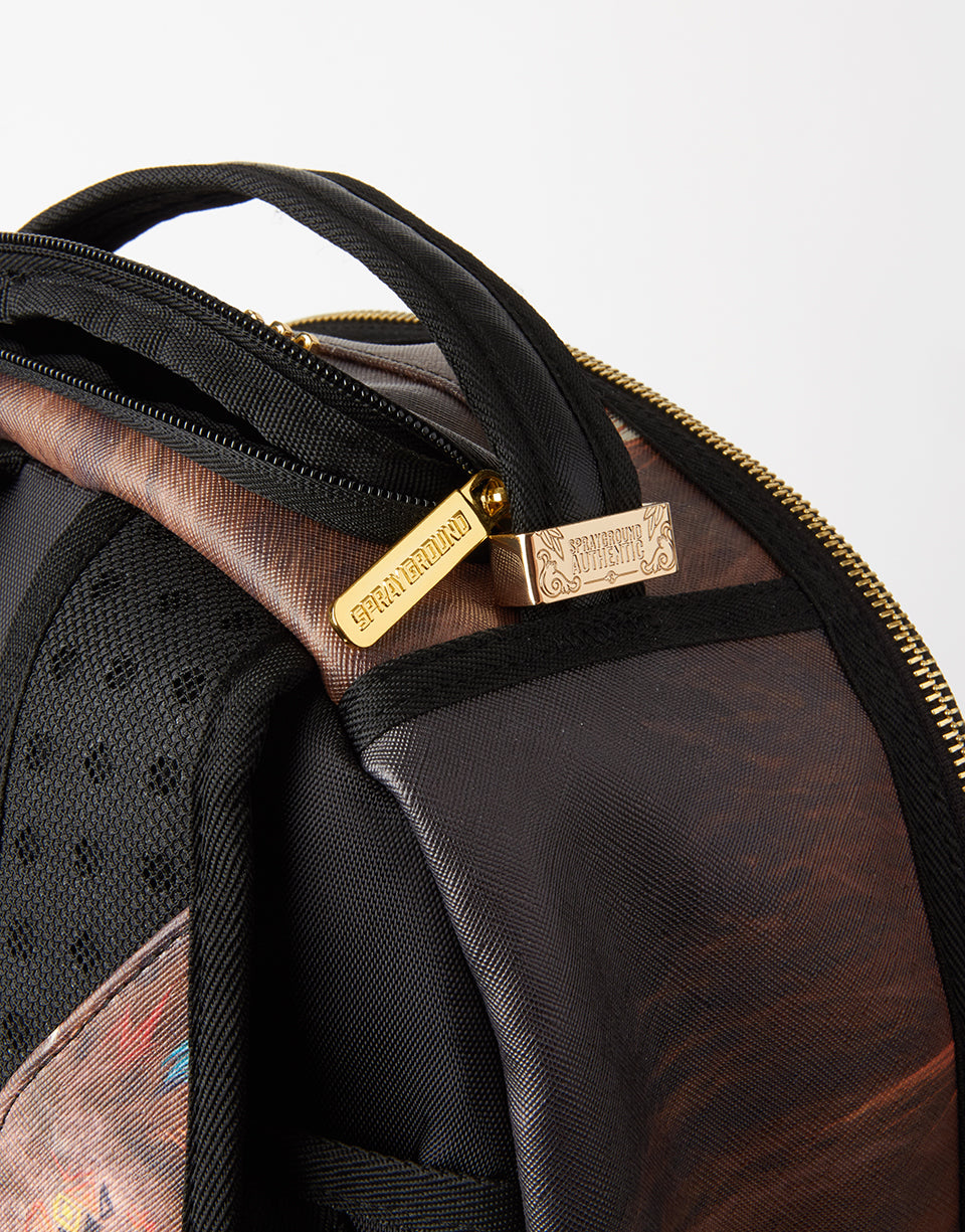 ExteriorDimensions: 18" x 6" x 11.5" • Front zipper pocket • Side pockets • Zippered Stash pocket • Separate velour sunglass compartment • Ergonomic mesh back padding • Adjustable Straps for custom sizing • Gold claw and red fringe zippers with metal hardware • Metal "Sprayground Authentic" badge • Slide through back sleeve connects to carry-on luggage to free your hands