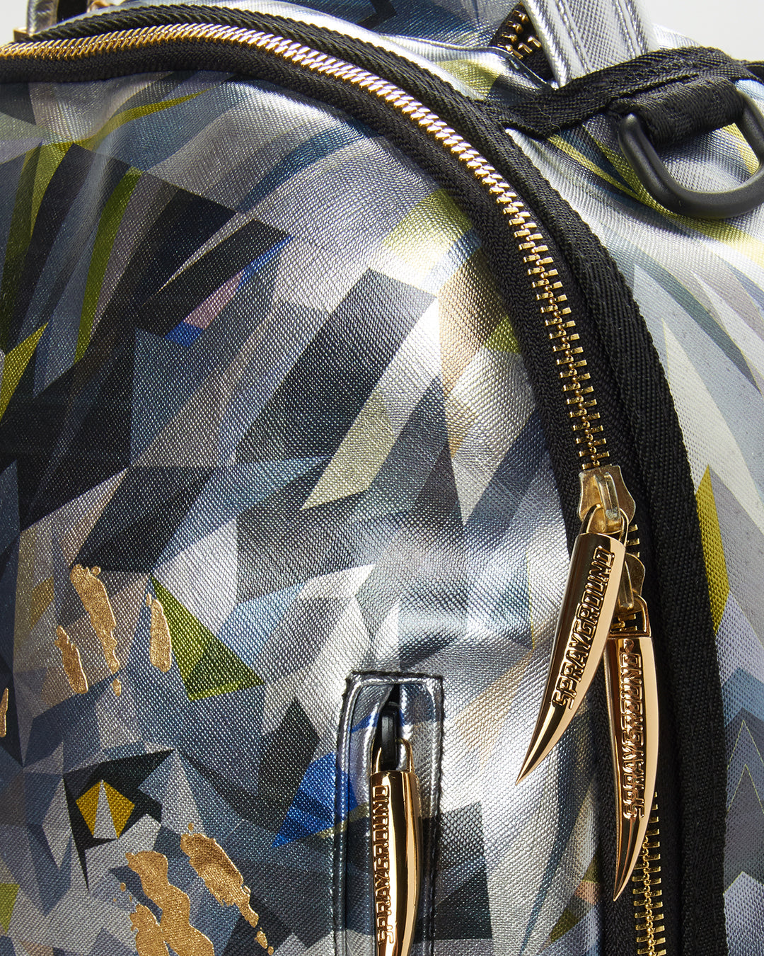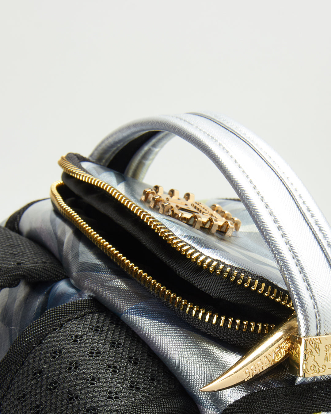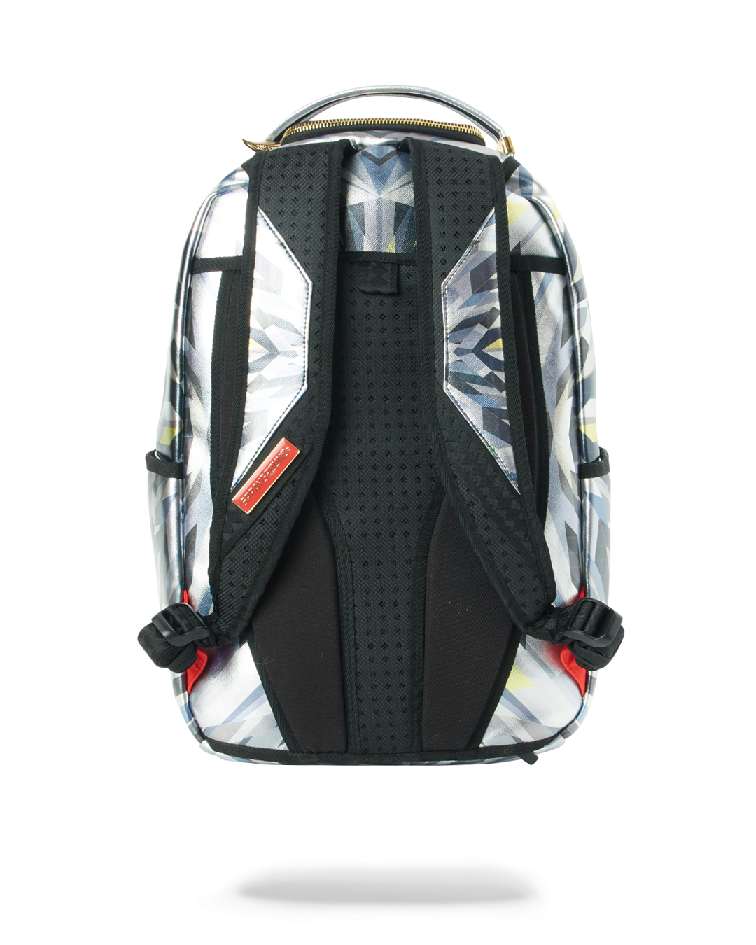ExteriorDimensions: 18" x 6" x 11.5" • Front zipper pocket • Side pockets • Zippered Stash pocket • Separate velour sunglass compartment • Ergonomic mesh back padding • Adjustable Straps for custom sizing • Gold claw and red fringe zippers with metal hardware • Metal "Sprayground Authentic" badge • Slide through back sleeve connects to carry-on luggage to free your hands