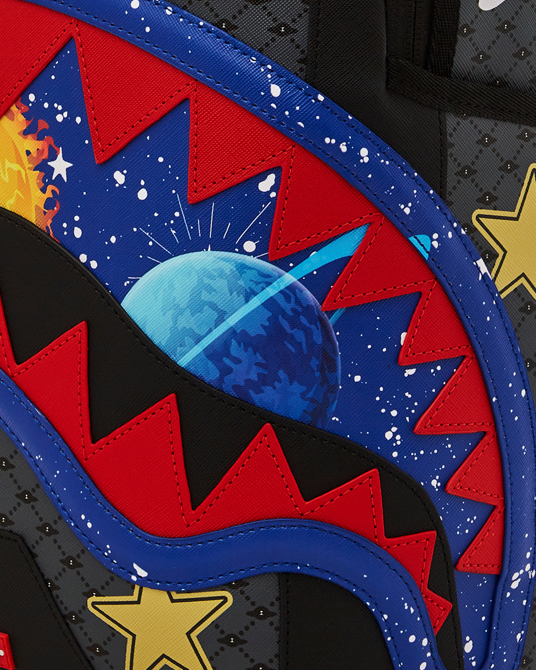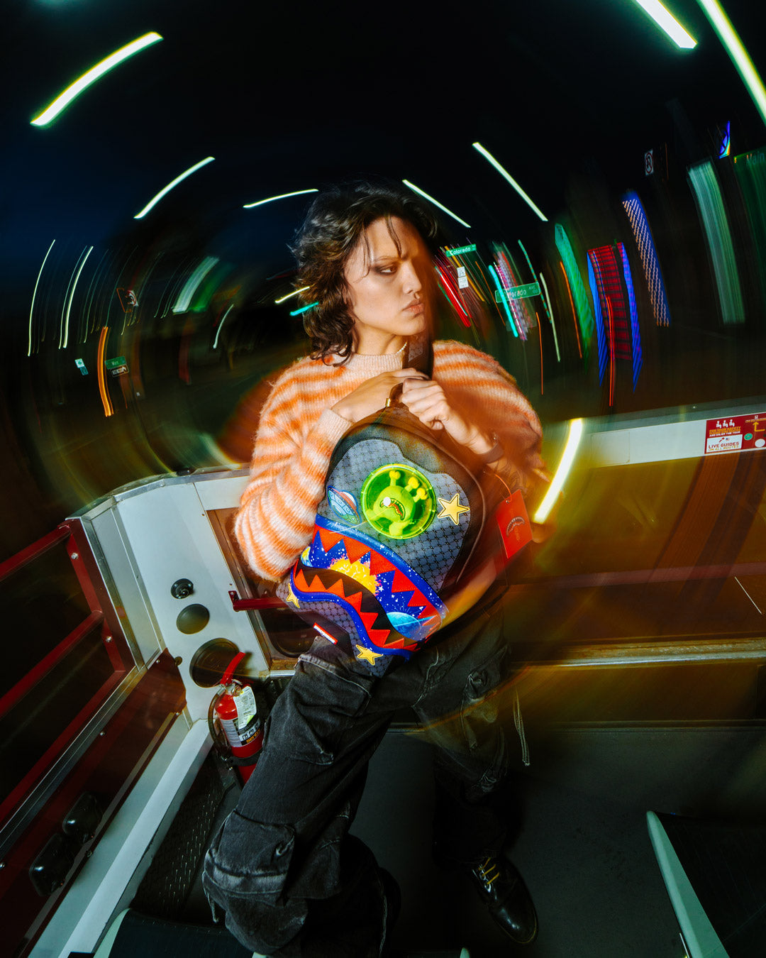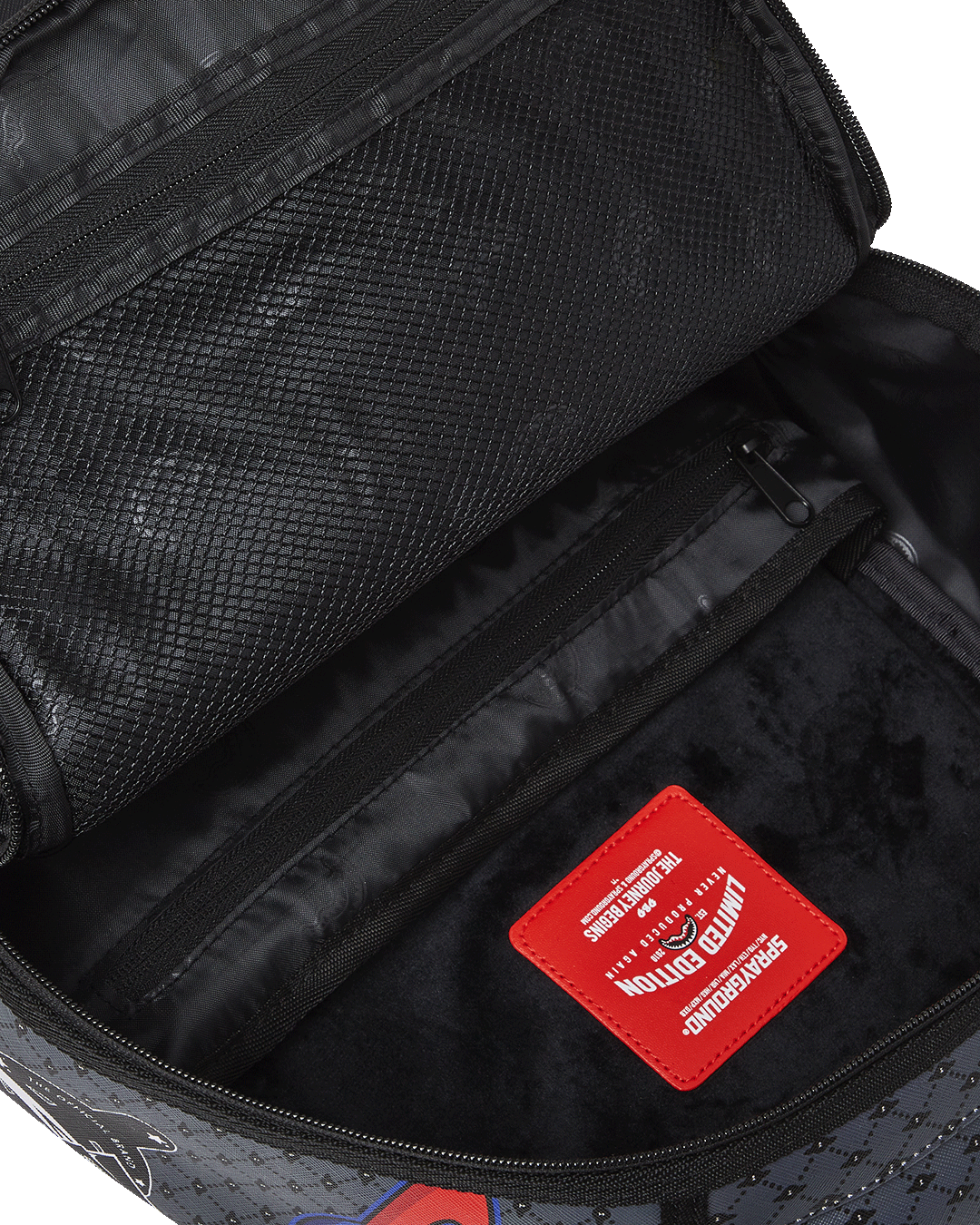 Dimensions: 18" x 6" x 11.5" • Front zipper pocket • Side pockets • Zippered Stash pocket • Separate velour sunglass compartment • Ergonomic mesh back padding • Adjustable Straps for custom sizing • Gold zippers with metal hardware • Metal "Sprayground Authentic" badge • Slide through back sleeve connects to carry-on luggage to free your hands