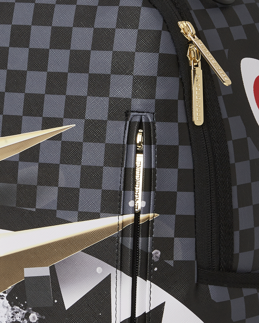 Dimensions: 18" x 6" x 11.5" • Front zipper pocket • Side pockets • Zippered Stash pocket • Separate velour sunglass compartment • Ergonomic mesh back padding • Adjustable Straps for custom sizing • Gold zippers with metal hardware • Metal "Sprayground Authentic" badge • Slide through back sleeve connects to carry-on luggage to free your hands