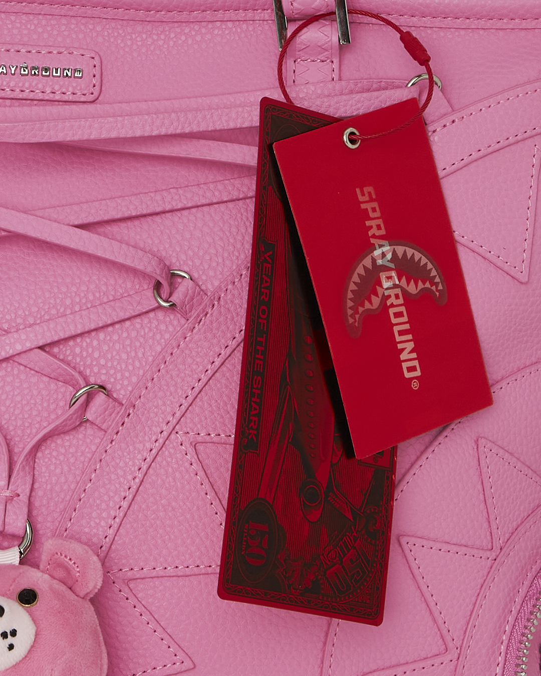 PVC with double sharkmouth cut and sew details, features decorative zipper detailing which includes a plush bear hanging from the center, laced pvc trim, side panels are decorated with silver metal studs, and a hanging mirror keychain