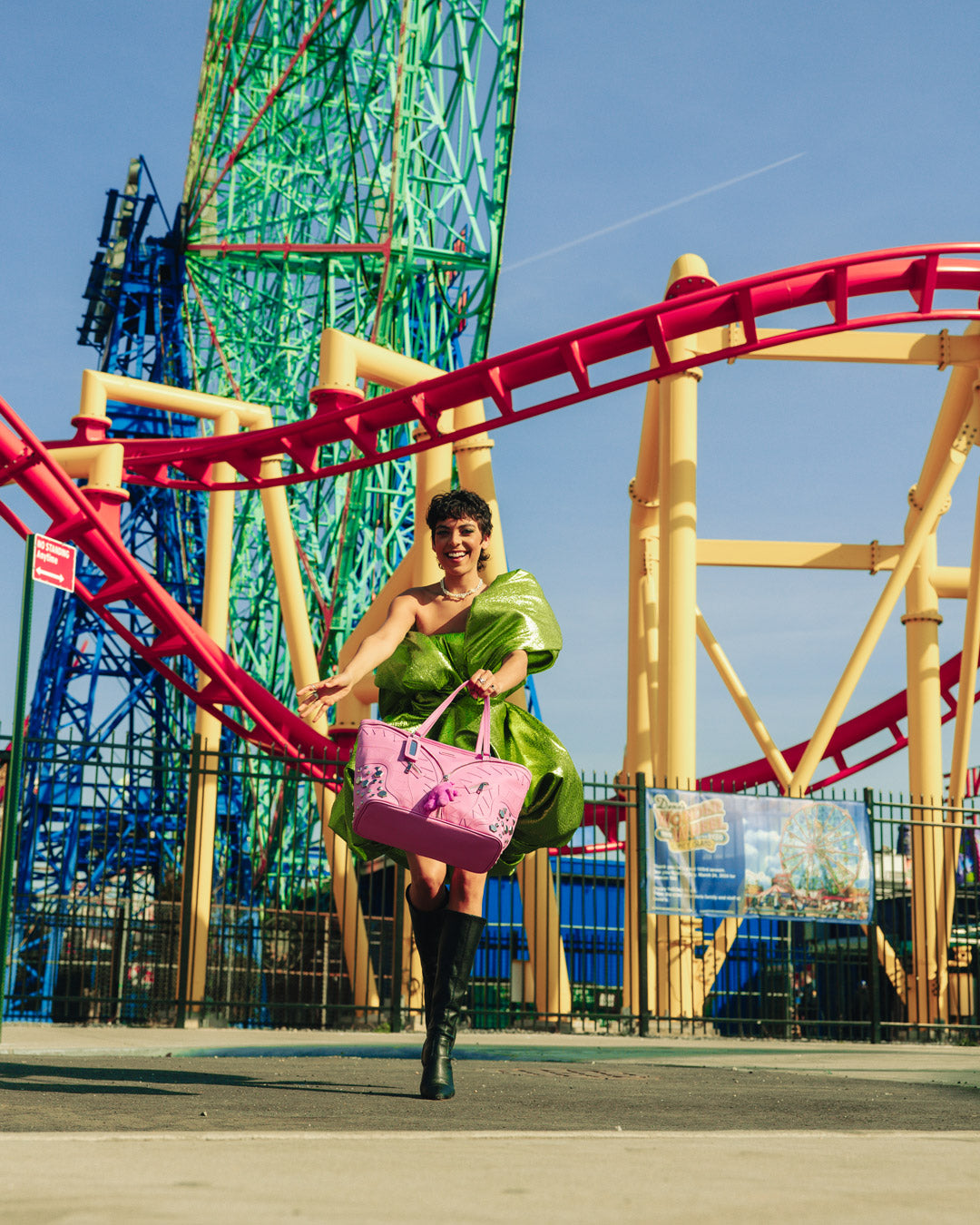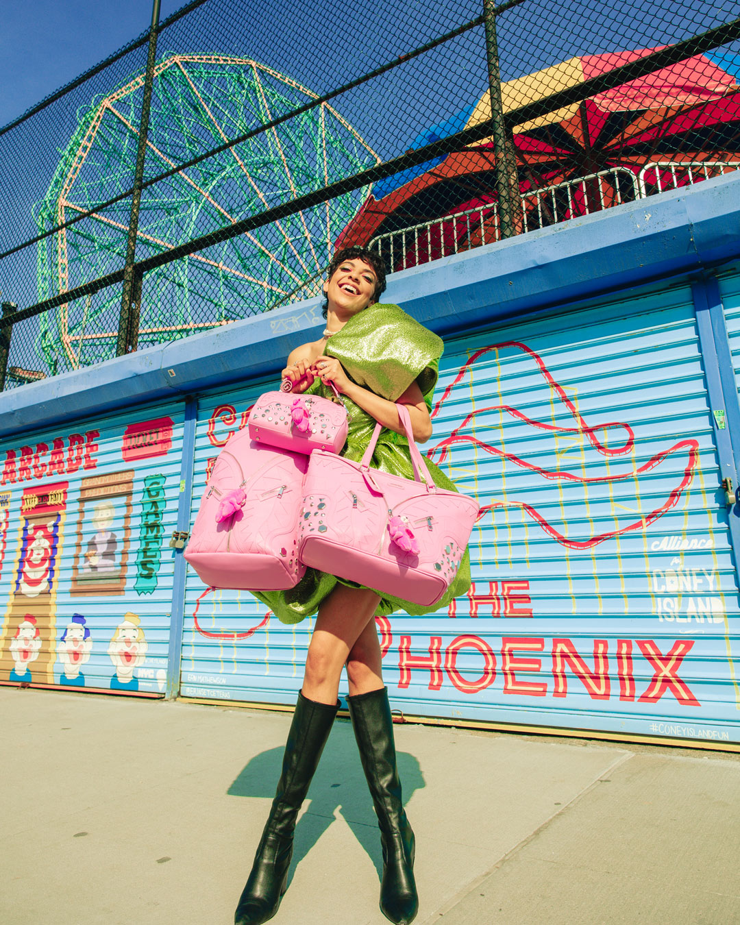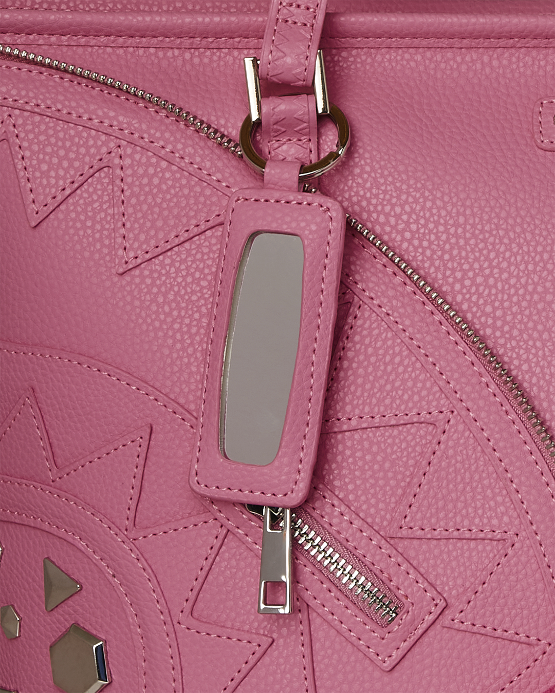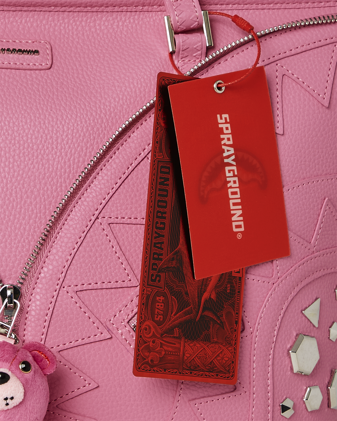 PVC with double sharkmouth cut and sew details, features decorative zipper detailing which includes a plush bear hanging from the center, side panels are decorated with silver metal studs, and a hanging mirror keychain