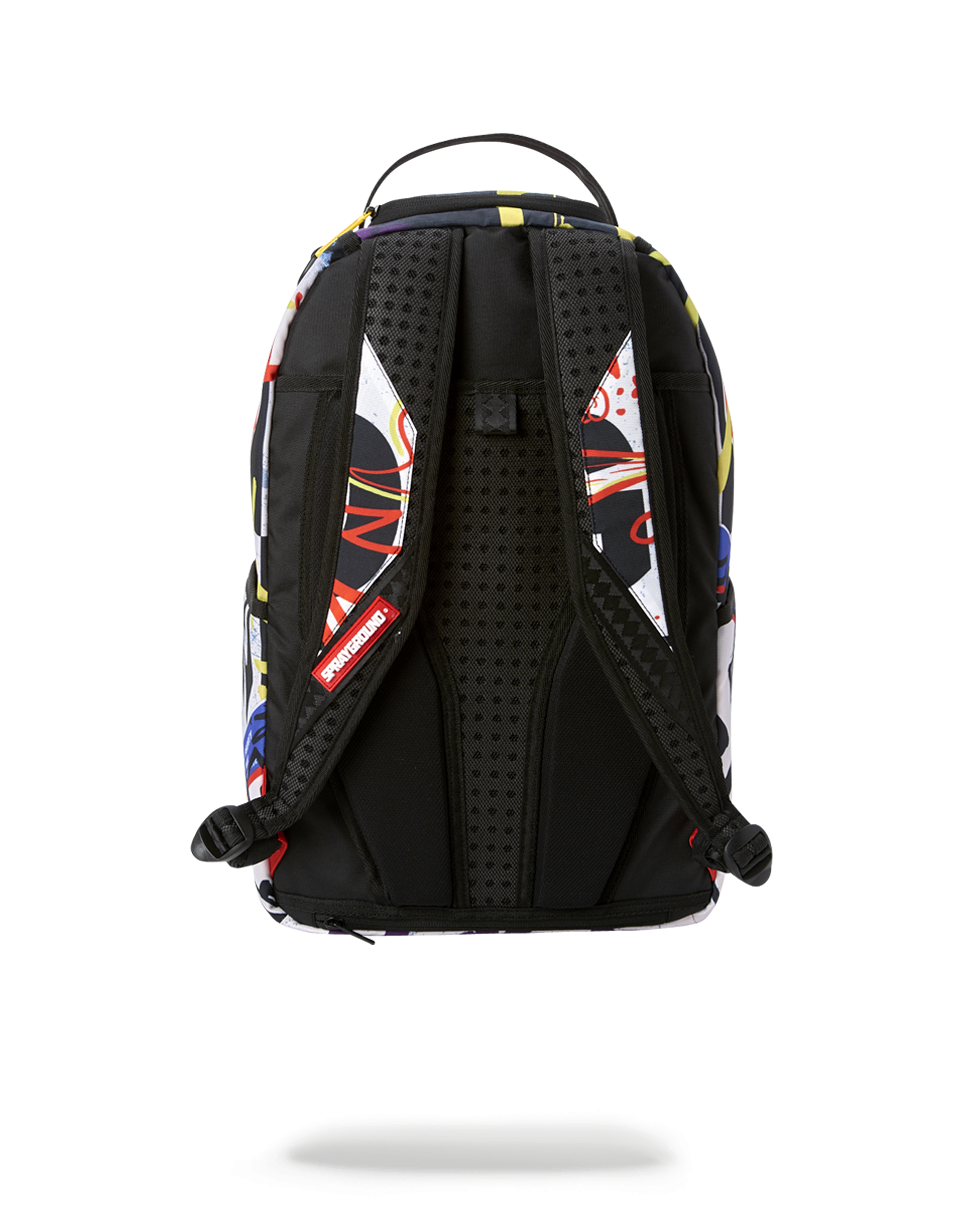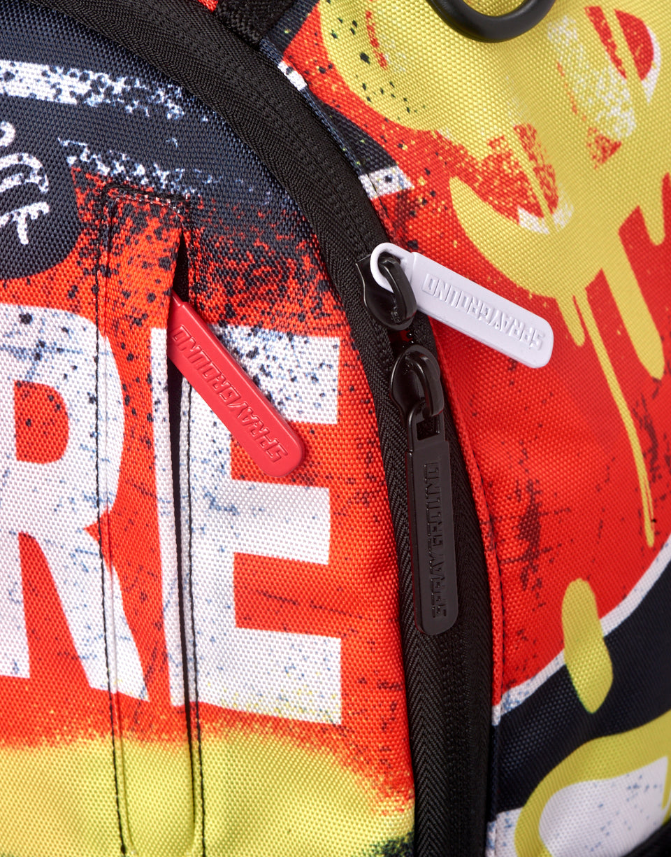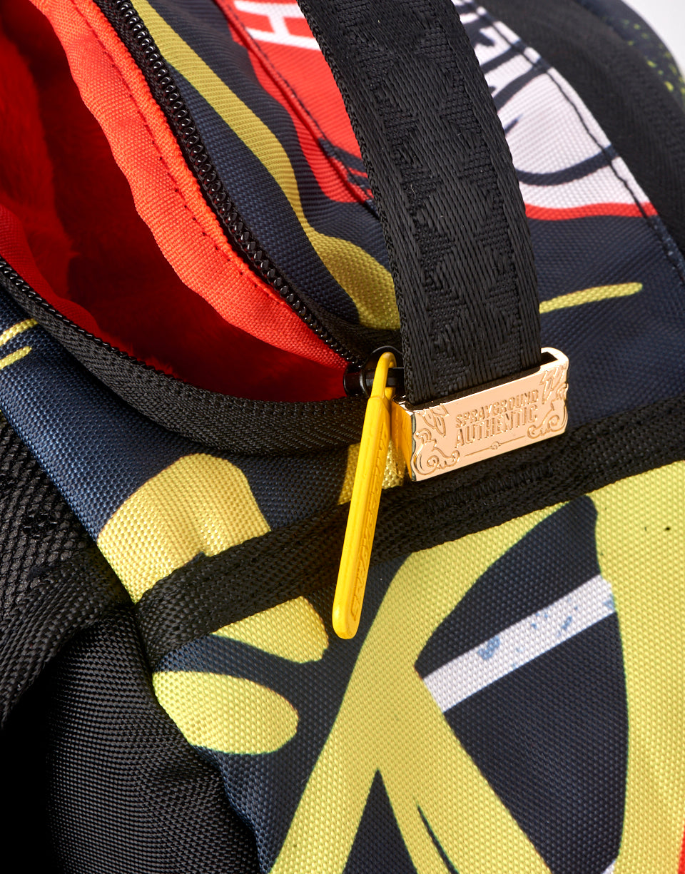 ExteriorDimensions: 18" x 6" x 11.5" • Front zipper pocket • Side pockets • Zippered Stash pocket • Separate velour sunglass compartment • Ergonomic mesh back padding • Adjustable Straps for custom sizing • Multicolor zippers with metal hardware • Metal "Sprayground Authentic" badge • Slide through back sleeve connects to carry-on luggage to free your hands