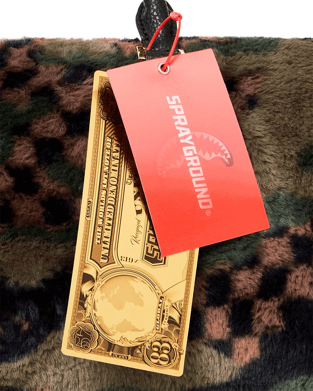 Dimensions: 8" x 7.5" x 13"• Metal zipper pocket• Back Zippers •Zippered sneaker pocket • gold zippers • Adjustable Straps for custom sizing •Metal Zippers with Metal Hardware • bag of Sprayground money