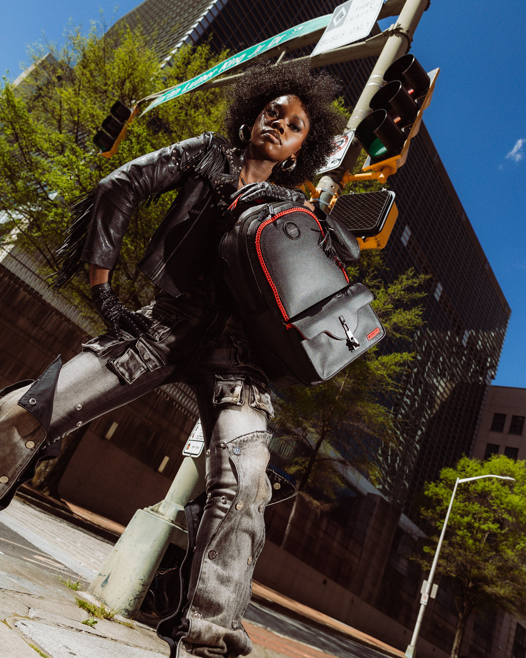 Large front cargo pocket featuring lock detail, red chain embellishment, red pvc handle, layered side panel detailing, metal vertical sharkmouth emblem surrounding Sprayground logo detailing