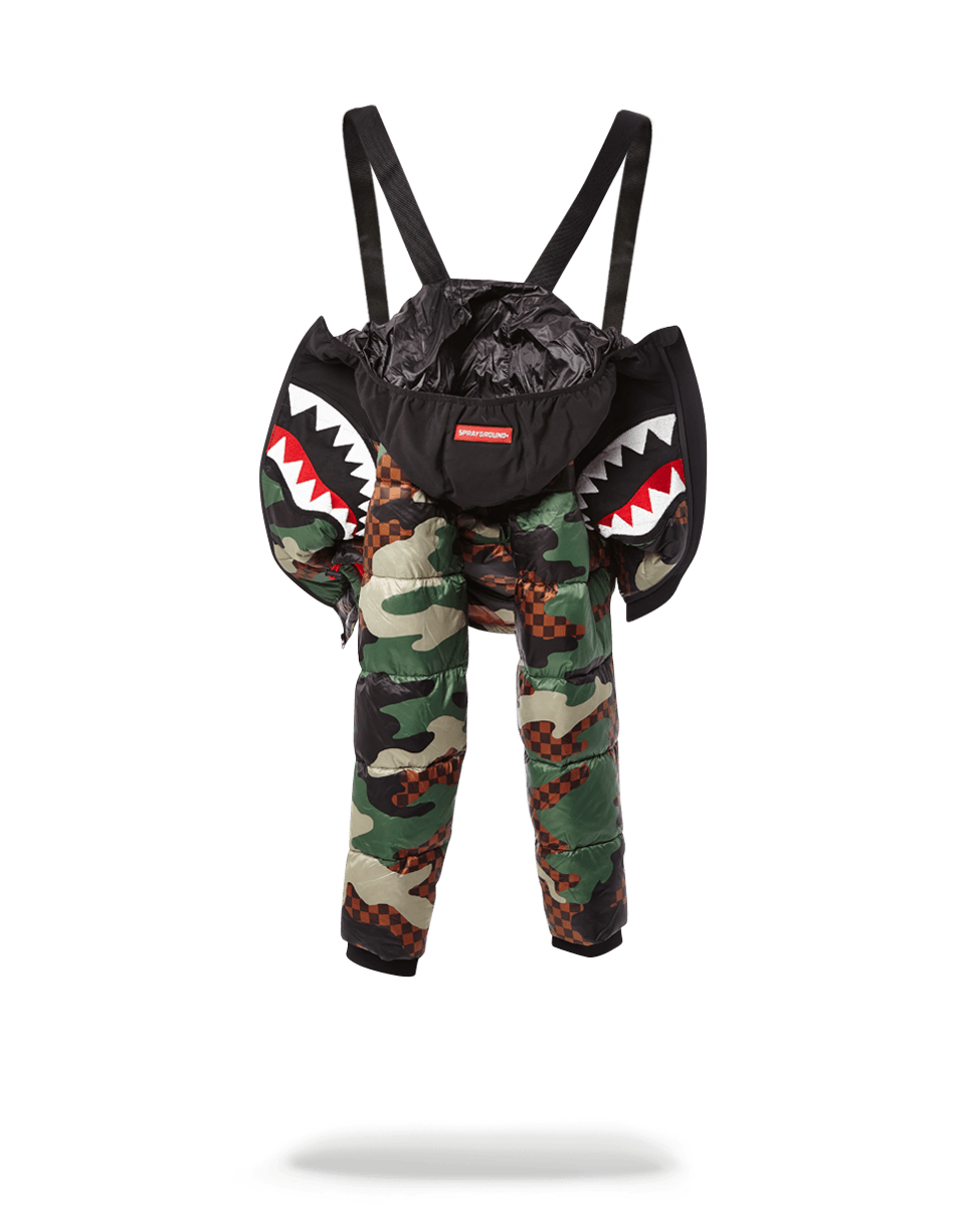 Not your average jacket! Every detail was designed with you in mind! Make the Sprayground Checkered Camo Puffer Jacket your daily fashion statement this winter. Featuring inner straps to have it hang on you when you need some cooling off and pop it back on for a super heavy down to keep you warm even on the coldest days. Durable water resistant fabric to last you for many seasons. Pick up the matching, gloves and headwear to complete the look.
