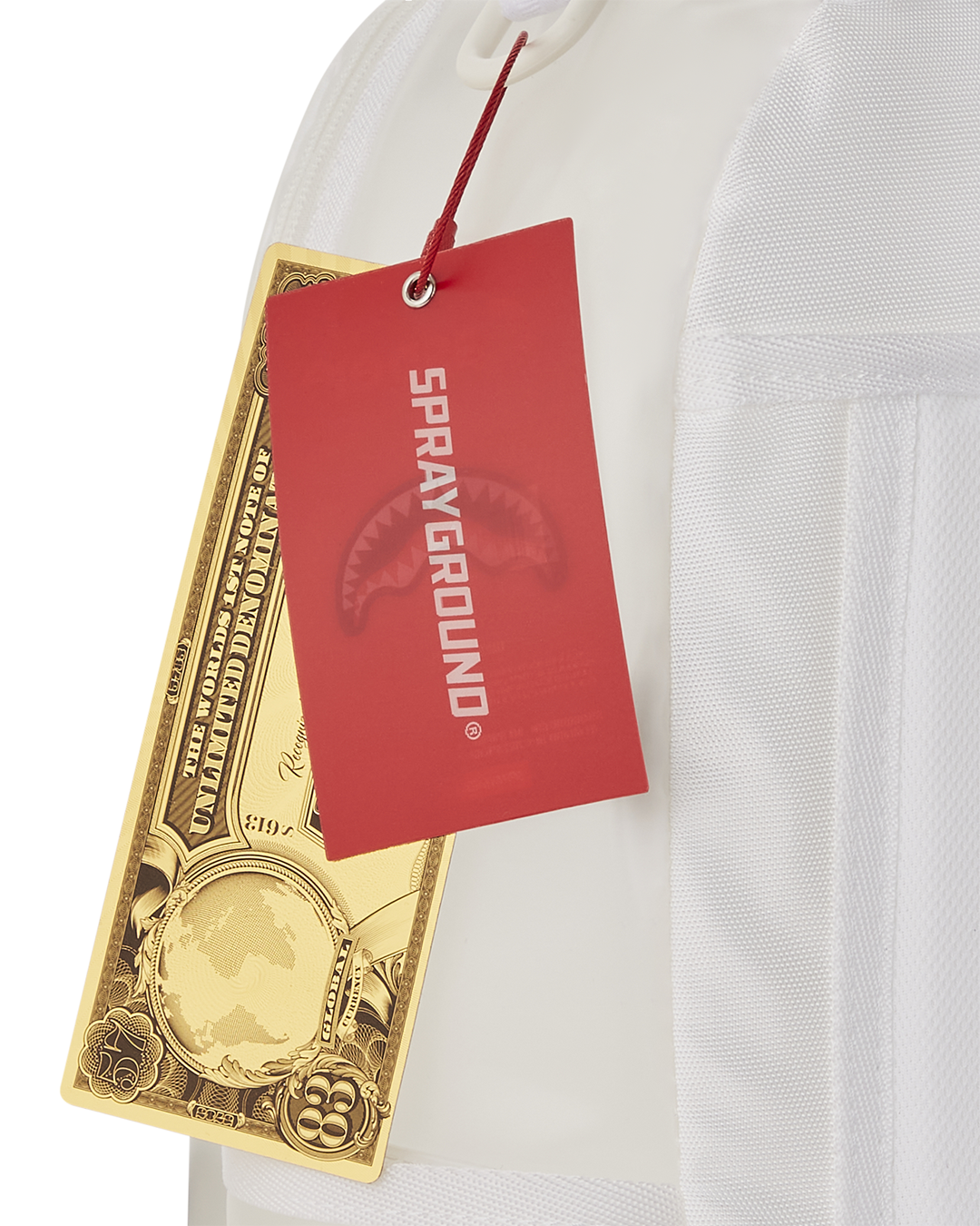 Dimensions: 18" x 6" x 11.5" • Front zipper pocket • Side pockets • Zippered Stash pocket • Separate velour sunglass compartment • Ergonomic mesh back padding • Adjustable Straps for custom sizing • Gold zippers with metal hardware • Metal "Sprayground Authentic" badge • Slide through back sleeve connects to carry-on luggage to free your hands