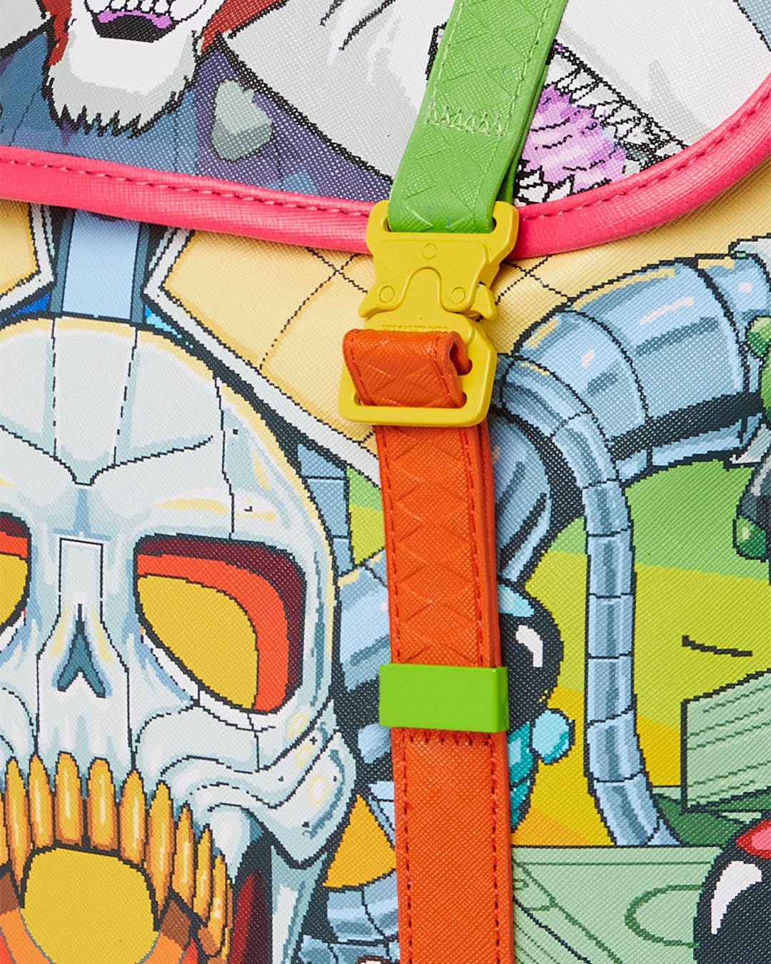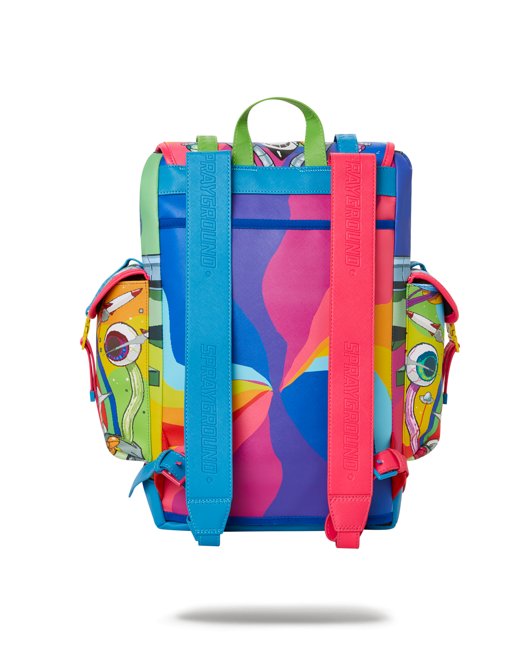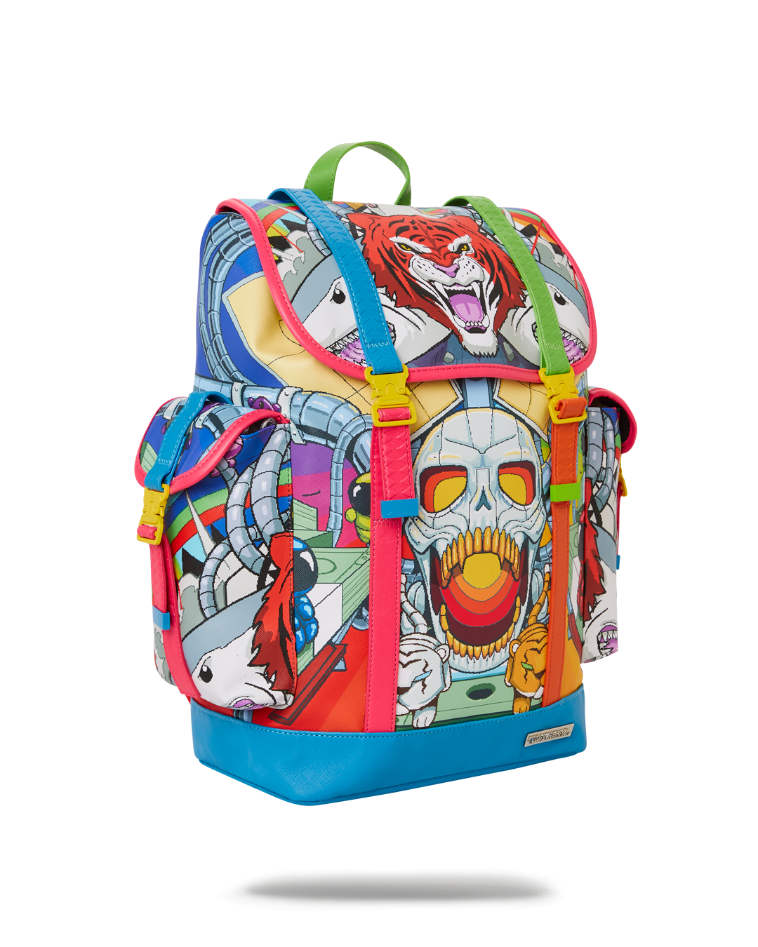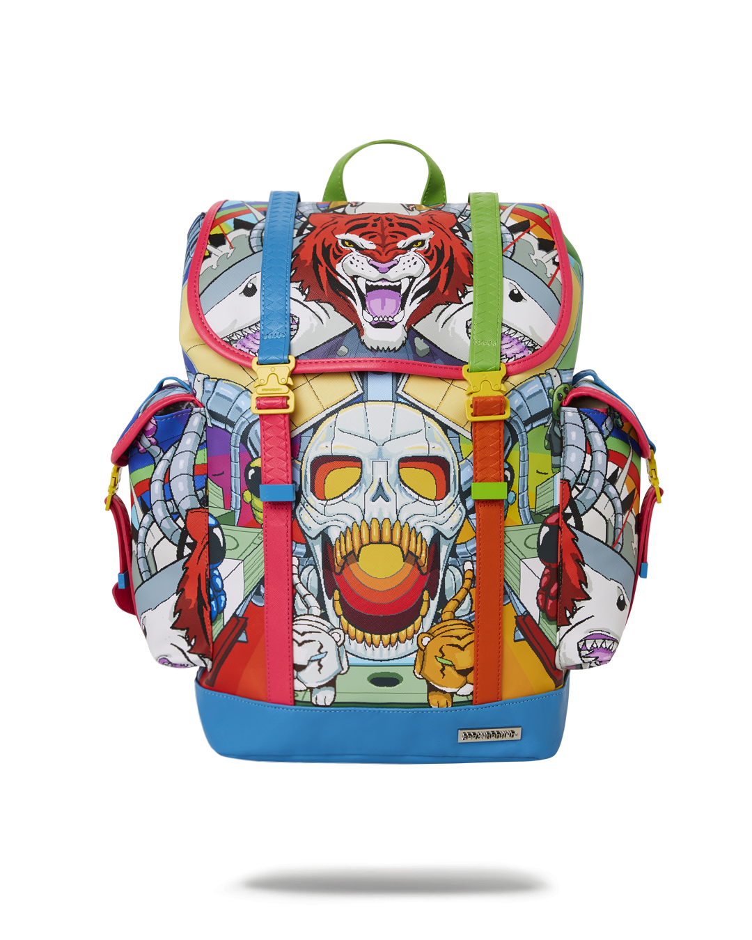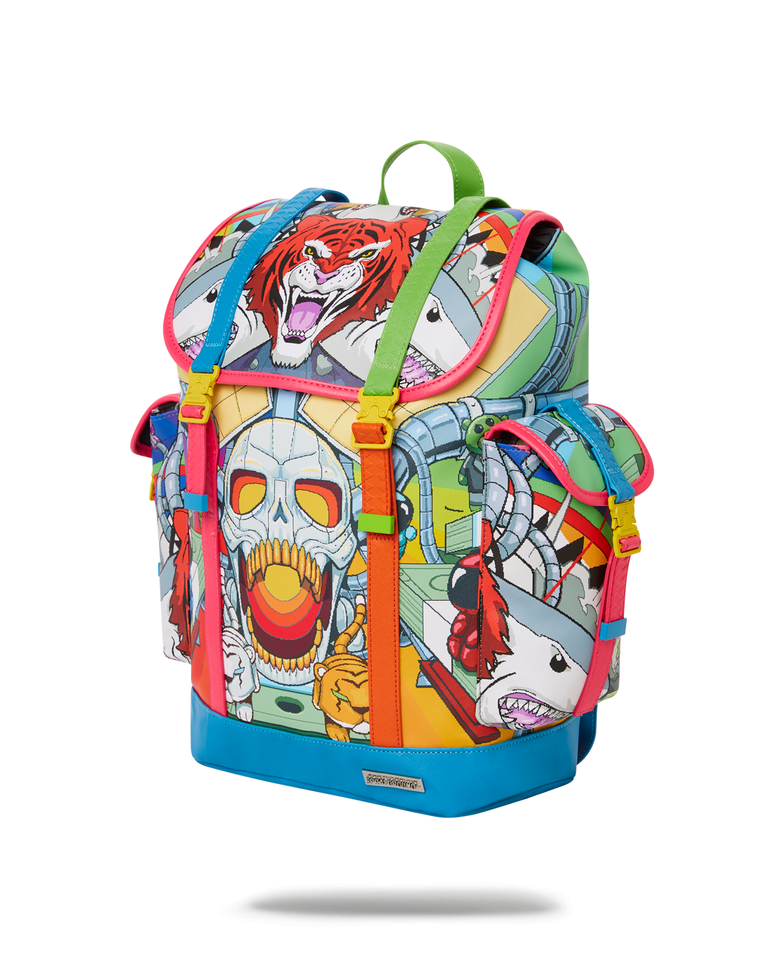 Dimensions: 18" x 6" x 11.5" • Top Flap opening w/ adjustable metal enamel buckles and drawstring closure • Two side cargo pockets with metal enamel buckles and drawstring closures • Zippered Stash pocket • Ergonomic mesh back padding • Adjustable Straps for custom sizing • Embossed logo on back strap