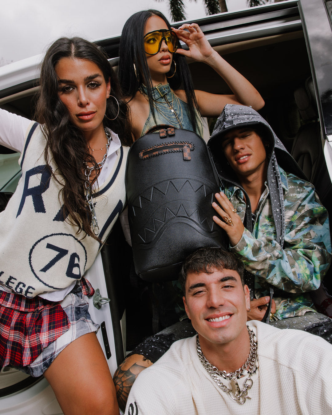 PVC bag with embossed details such as the sharkmouth, zipper pullers, and ID tag. Sewn faux leather details around the front zipper pocket and ID tag.