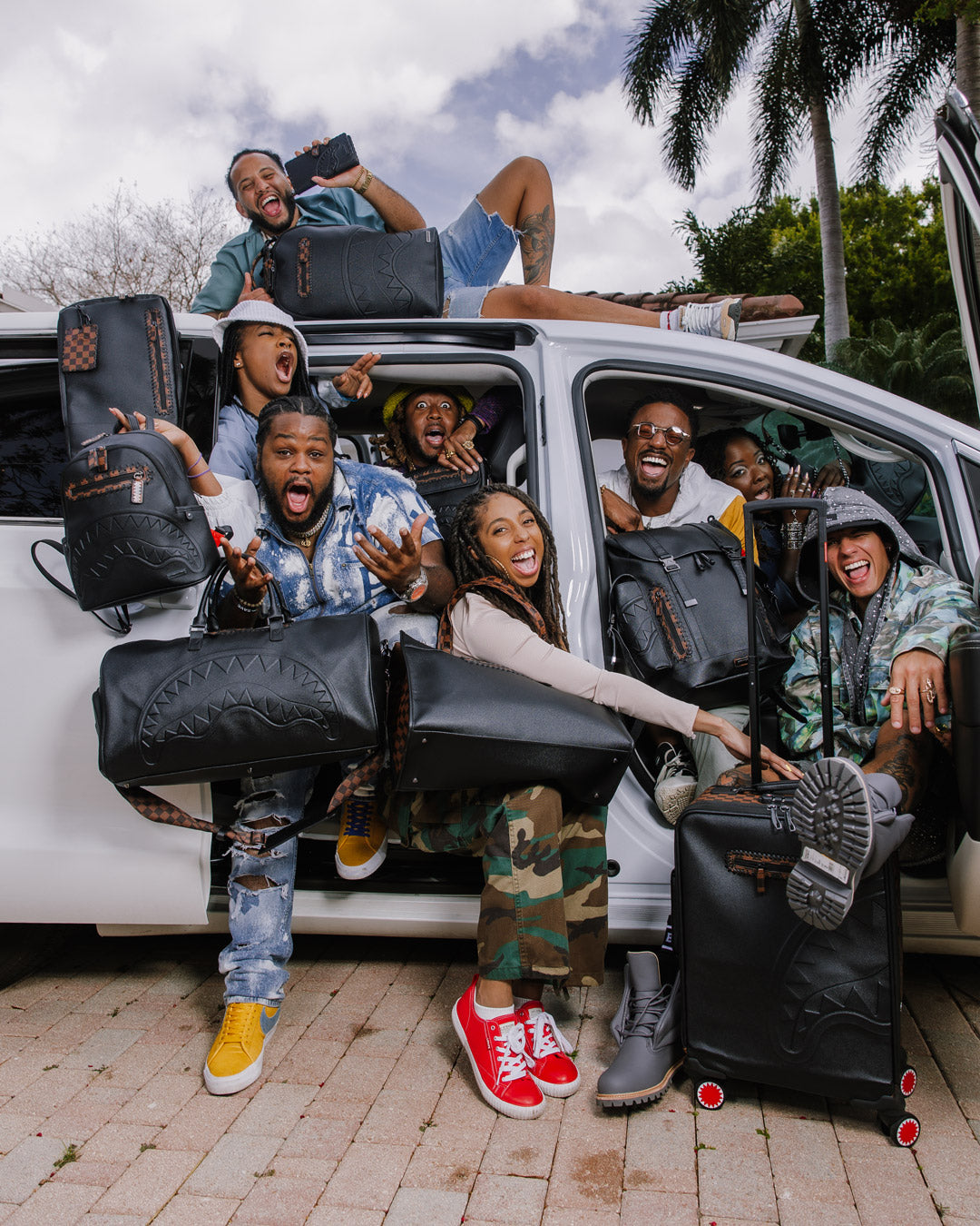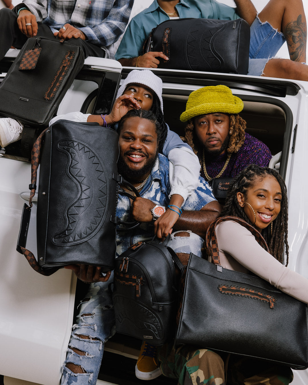 PVC bag with embossed details such as the sharkmouth and zipper pullers Sewn faux leather details around the front zipper pocket.
