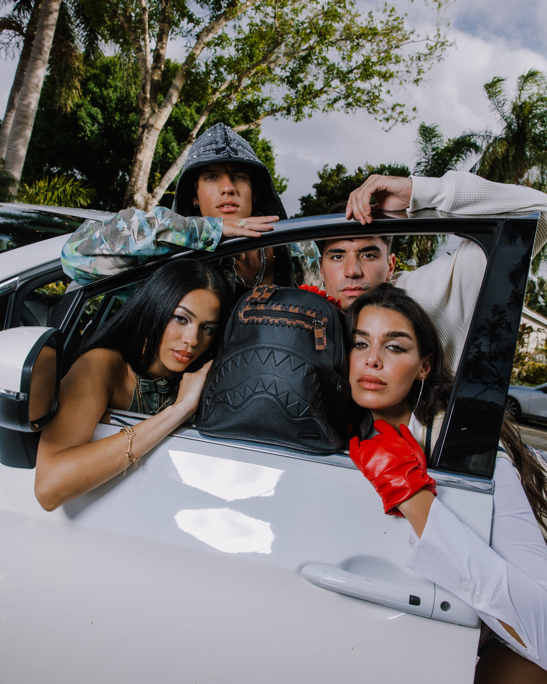 PVC bag with embossed details such and the sharkmouth and zipper pullers Sewn faux leather details around the front zipper pocket.