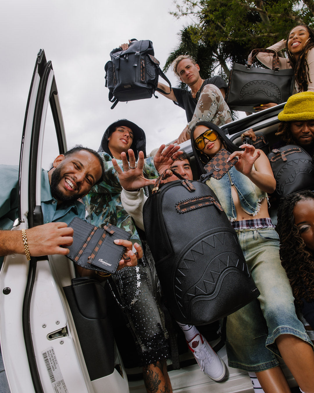 PVC wallet with embossed details such as the sharkmouth and zipper pullers. Sewn faux leather details around the front zipper pocket.