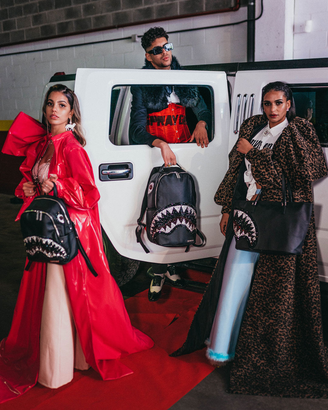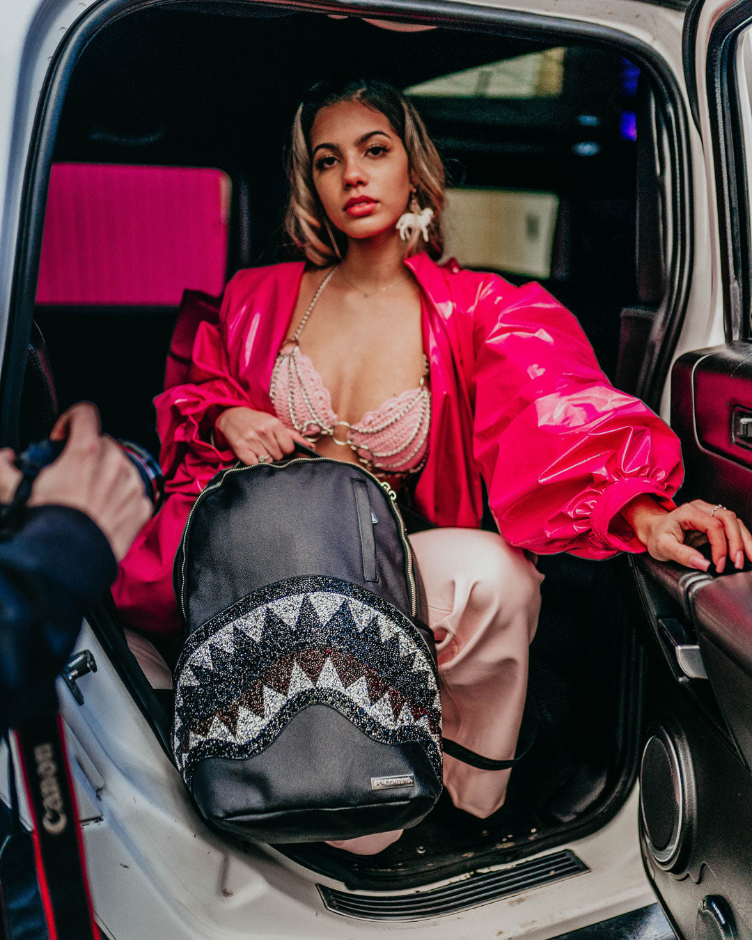 ExteriorDimensions: 18" x 6" x 11.5" • Front zipper pocket • Side pockets • Zippered Stash pocket • Separate velour sunglass compartment • Ergonomic mesh back padding • Adjustable Straps for custom sizing • Gold zippers with metal hardware • Metal "Sprayground Authentic" badge • Slide through back sleeve connects to carry-on luggage to free your hands