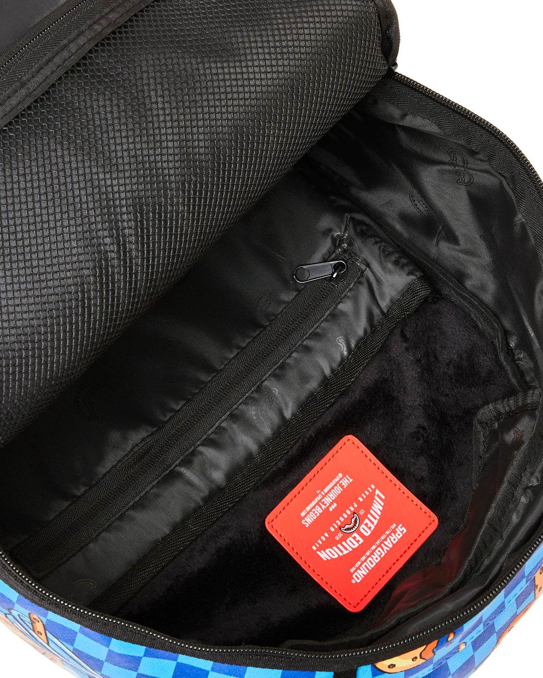 Dimensions: 18" x 6" x 11.5" • Front zipper pocket • Side pockets • Zippered Stash pocket • Separate velour sunglass compartment • Ergonomic mesh back padding • Adjustable Straps for custom sizing • Gold zippers with metal hardware • Metal "Sprayground Authentic" badge • Slide through back sleeve connects to carry-on luggage to free your hands