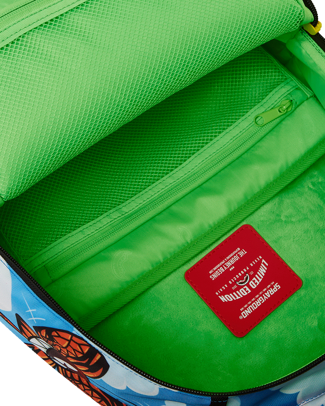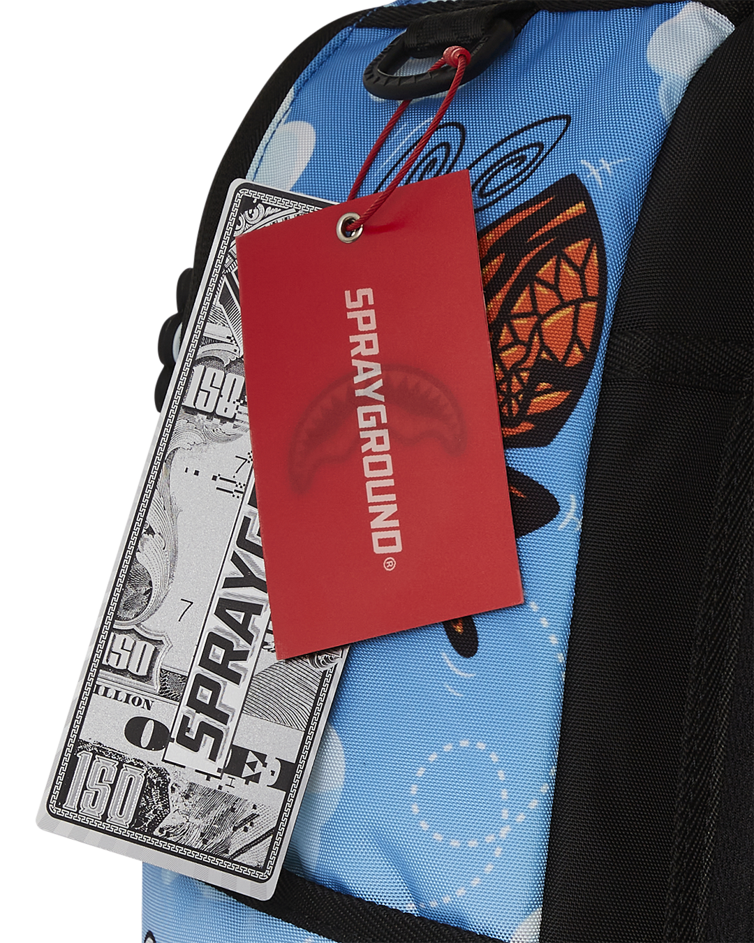 Dimensions: 18" x 6" x 11.5" • Front zipper pocket • Side pockets • Zippered Stash pocket • Separate velour sunglass compartment • Ergonomic mesh back padding • Adjustable Straps for custom sizing • Gold zippers with metal hardware • Metal "Sprayground Authentic" badge • Slide through back sleeve connects to carry-on luggage to free your hands