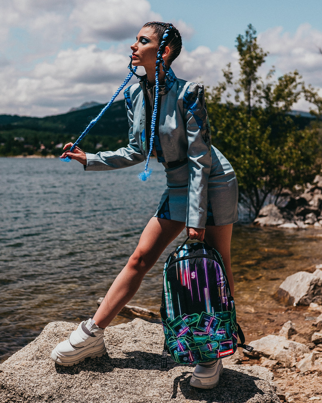 SPRAYGROUND 2077. The Neon Lights of Shark City Glow at Night with The New Limited Edition Crypto Stacks & Nite Dragon Backpacks, Luggage, Tote, Pouch & FaceMask. GLOWS NOW!