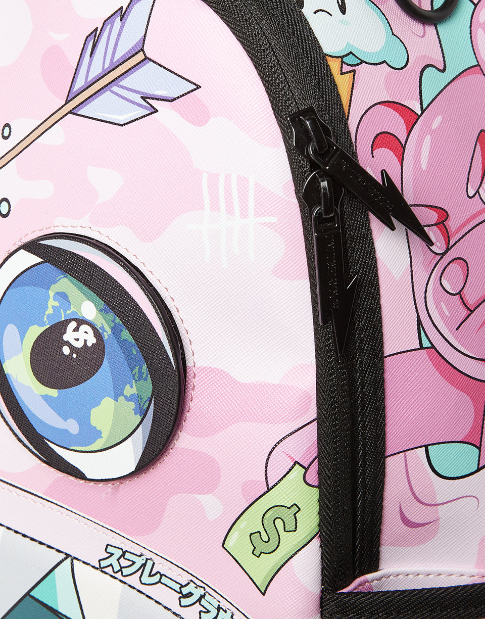 ExteriorDimensions: 18" x 6" x 11.5" • Side pockets • Zippered Stash pocket • Separate velour sunglass compartment • Ergonomic mesh back padding • Adjustable Straps for custom sizing • Black lightning bolt zippers with metal hardware • Metal "Sprayground Authentic" badge • Slide through back sleeve connects to carry-on luggage to free your hands
