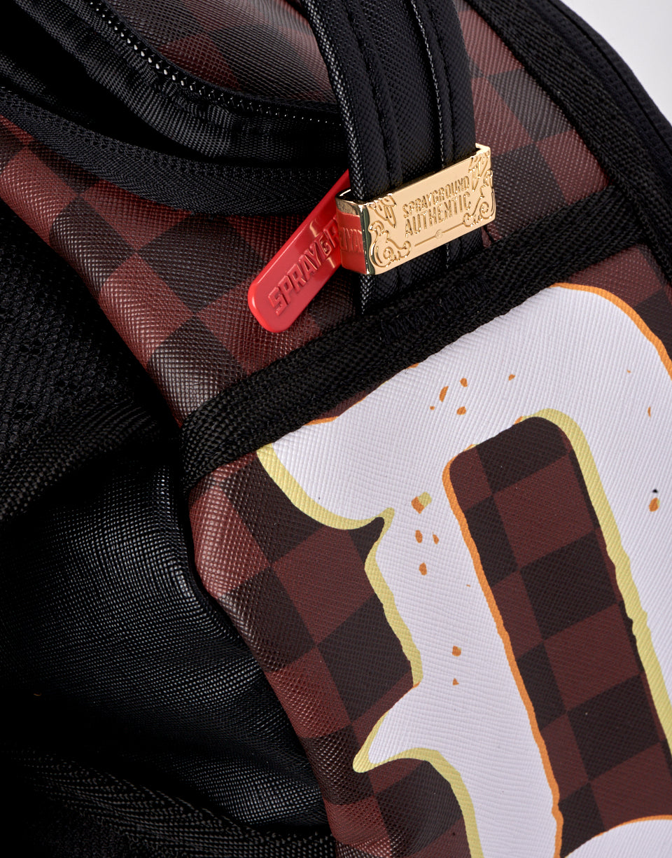 ExteriorDimensions: 18" x 6" x 11.5" • Front zipper pocket • Side pockets • Zippered Stash pocket • Separate velour sunglass compartment • Ergonomic mesh back padding • Adjustable Straps for custom sizing • Red zippers with metal hardware • Metal "Sprayground Authentic" badge • Slide through back sleeve connects to carry-on luggage to free your hands