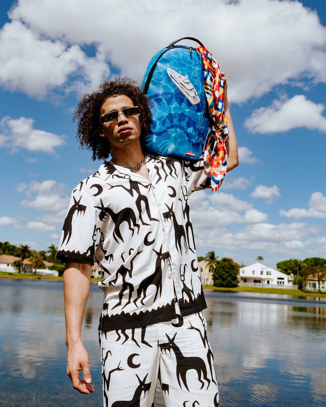 Dimensions: 18" x 6" x 11.5" • Front zipper pocket • Side pockets • Zippered Stash pocket • Separate velour sunglass compartment • Ergonomic mesh back padding • Adjustable Straps for custom sizing • Gold zippers with metal hardware • Metal "Sprayground Authentic" badge • Slide through back sleeve connects to carry-on luggage to free your hands