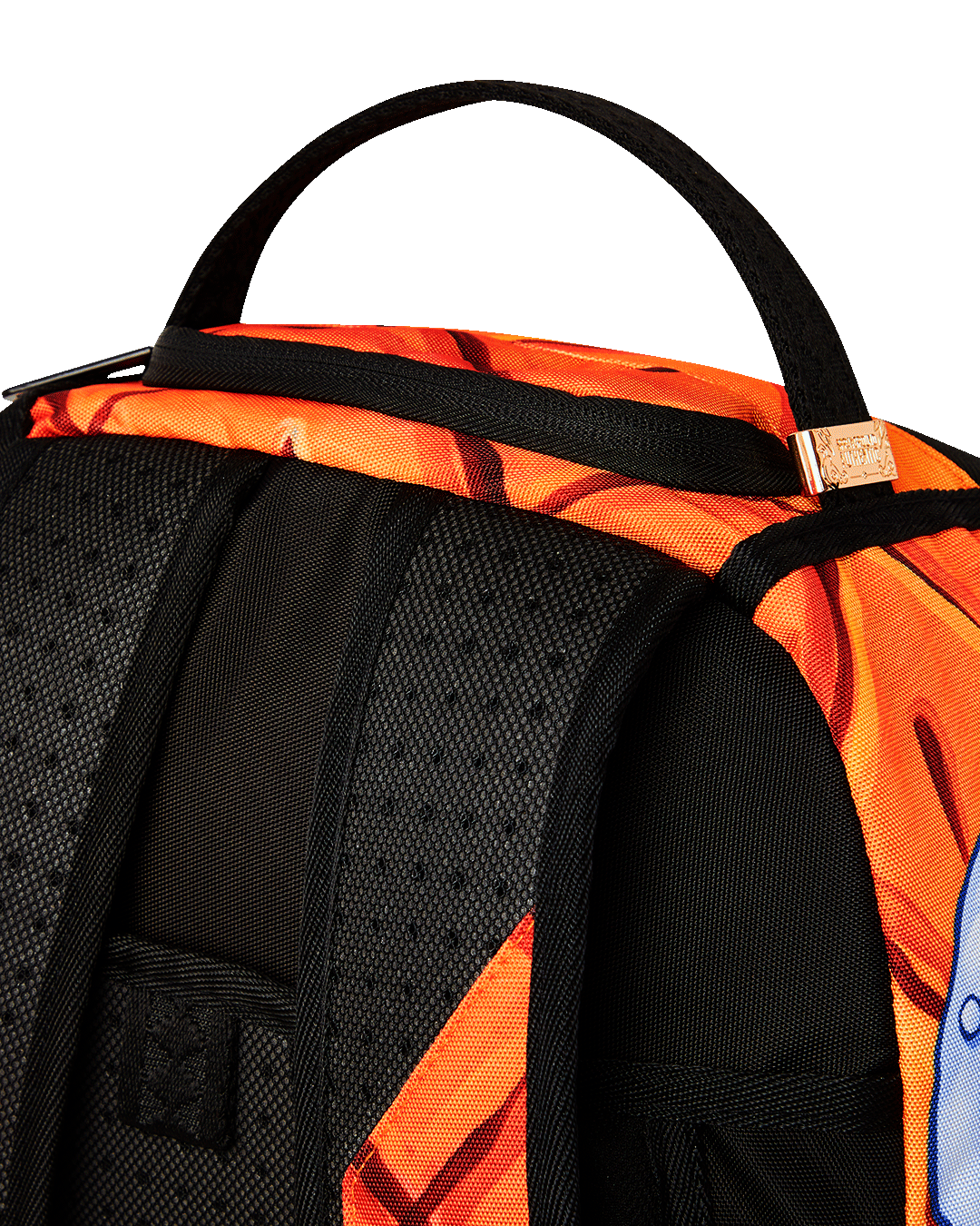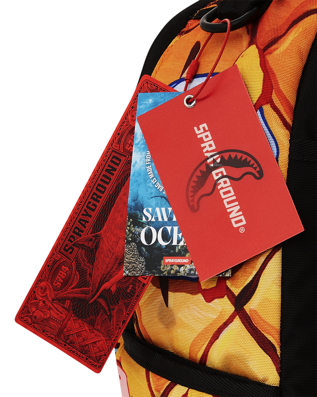 Dimensions: 18" x 6" x 11.5" • Front zipper pocket • Side pockets • Zippered Stash pocket • Separate velour sunglass compartment • Ergonomic mesh back padding • Adjustable Straps for custom sizing • Gold zippers with metal hardware • Metal "Sprayground Authentic" badge • Slide through back sleeve connects to carry-on luggage to free your hands