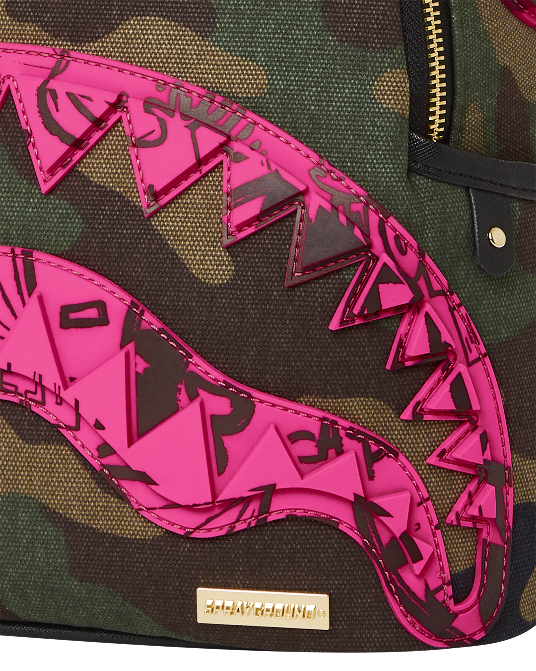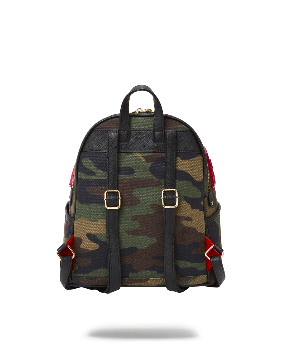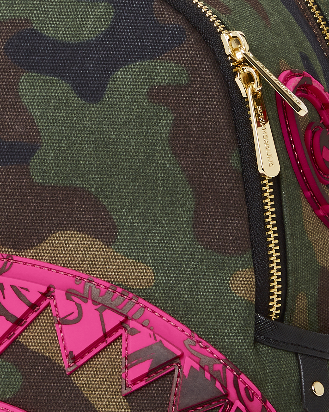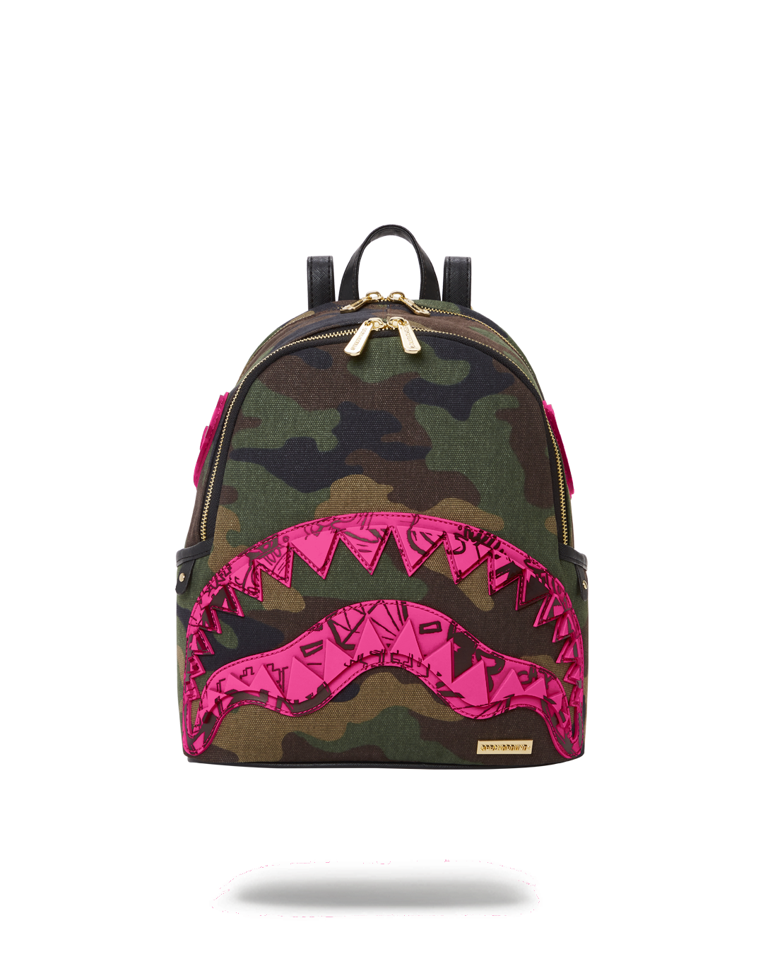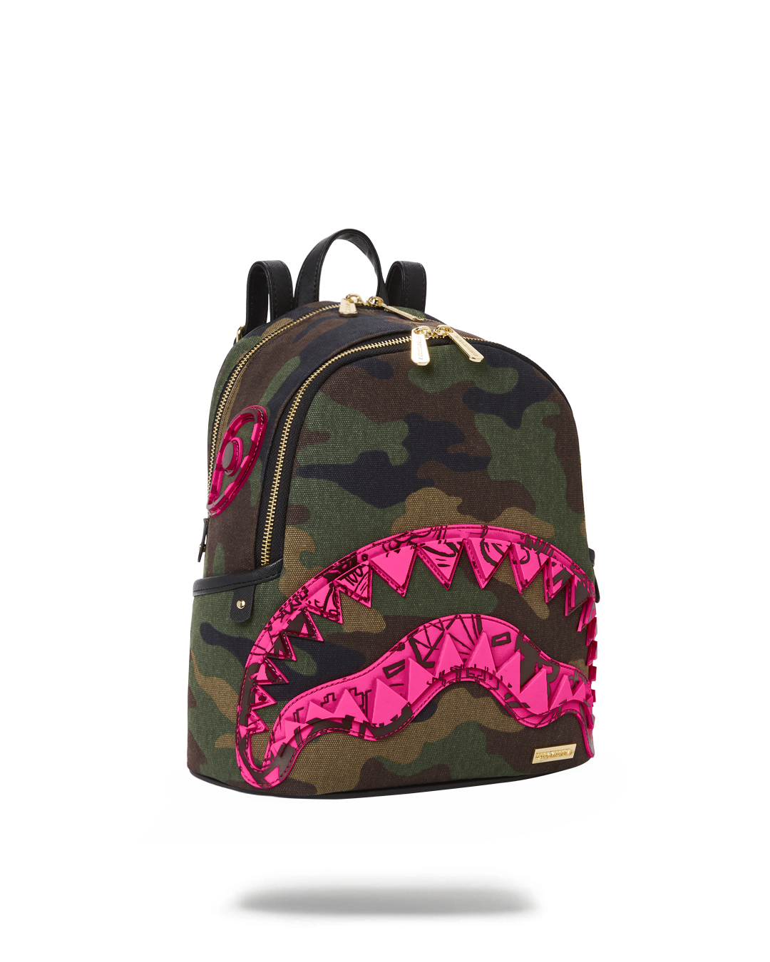 Dimensions: 10" x 5" x 11.5" • Rubber Shark Mouth Two large main zippered compartments • Side pockets • Zippered Stash pocket • Adjustable straps for custom sizing • Gold zippers with metal hardware