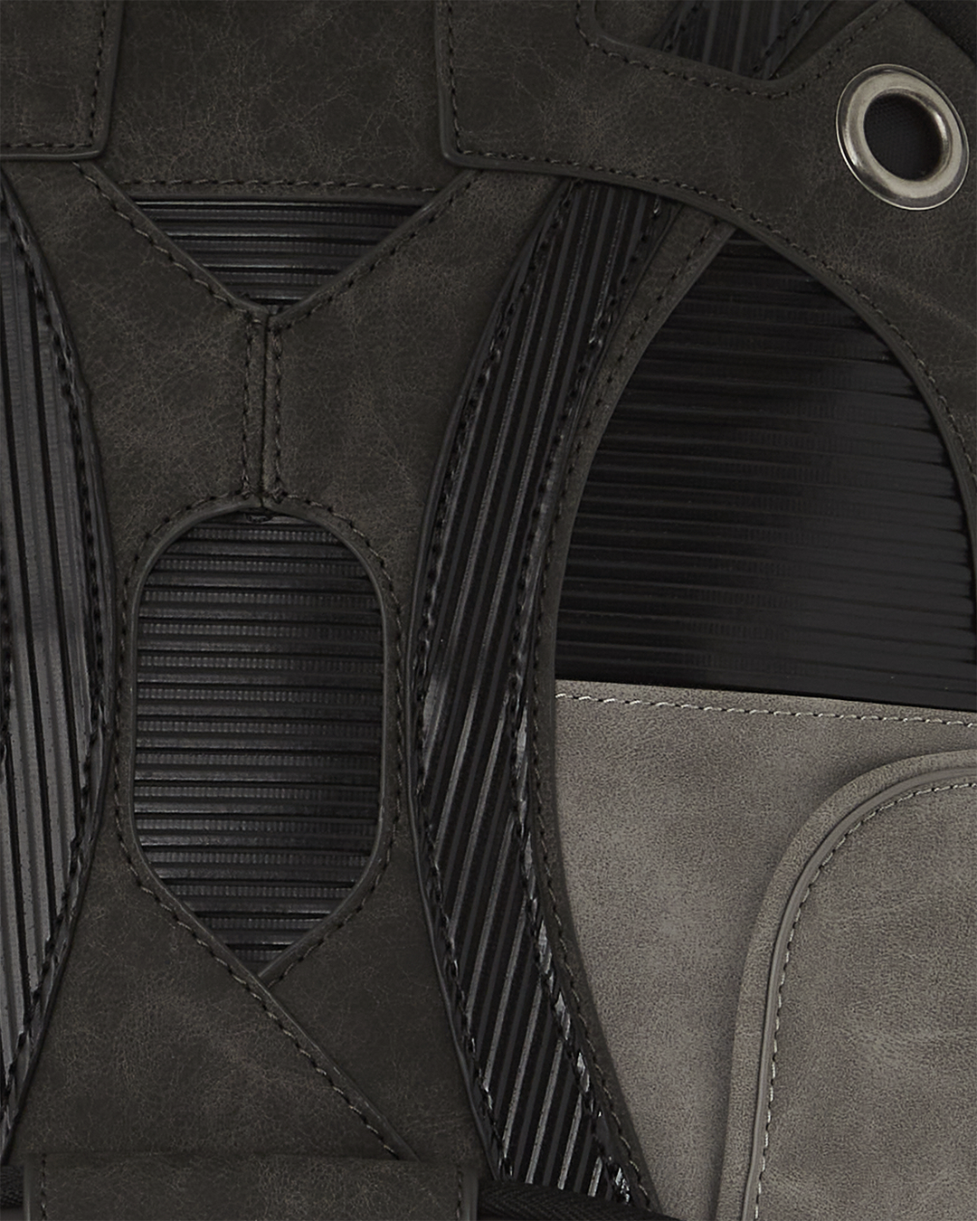 Rubber molded bottom, distressed faux leather, rubber sharkmouth pocket featuring buckle and grommet details, industrial top handle, faux suede and canvas trim details