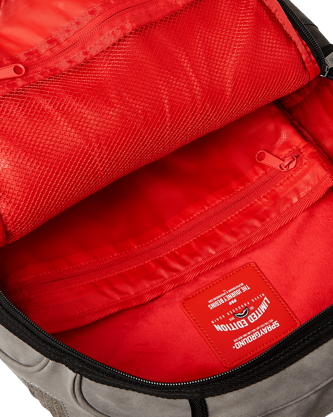 Dimensions: 18" x 6" x 11.5" • Front zipper pocket • Side pockets • Zippered Stash pocket • Separate velour sunglass compartment • Ergonomic mesh back padding • Adjustable Straps for custom sizing • Gold zippers with metal hardware • Metal "Sprayground Authentic" badge • Slide through back sleeve connects to carry-on luggage to free your hands