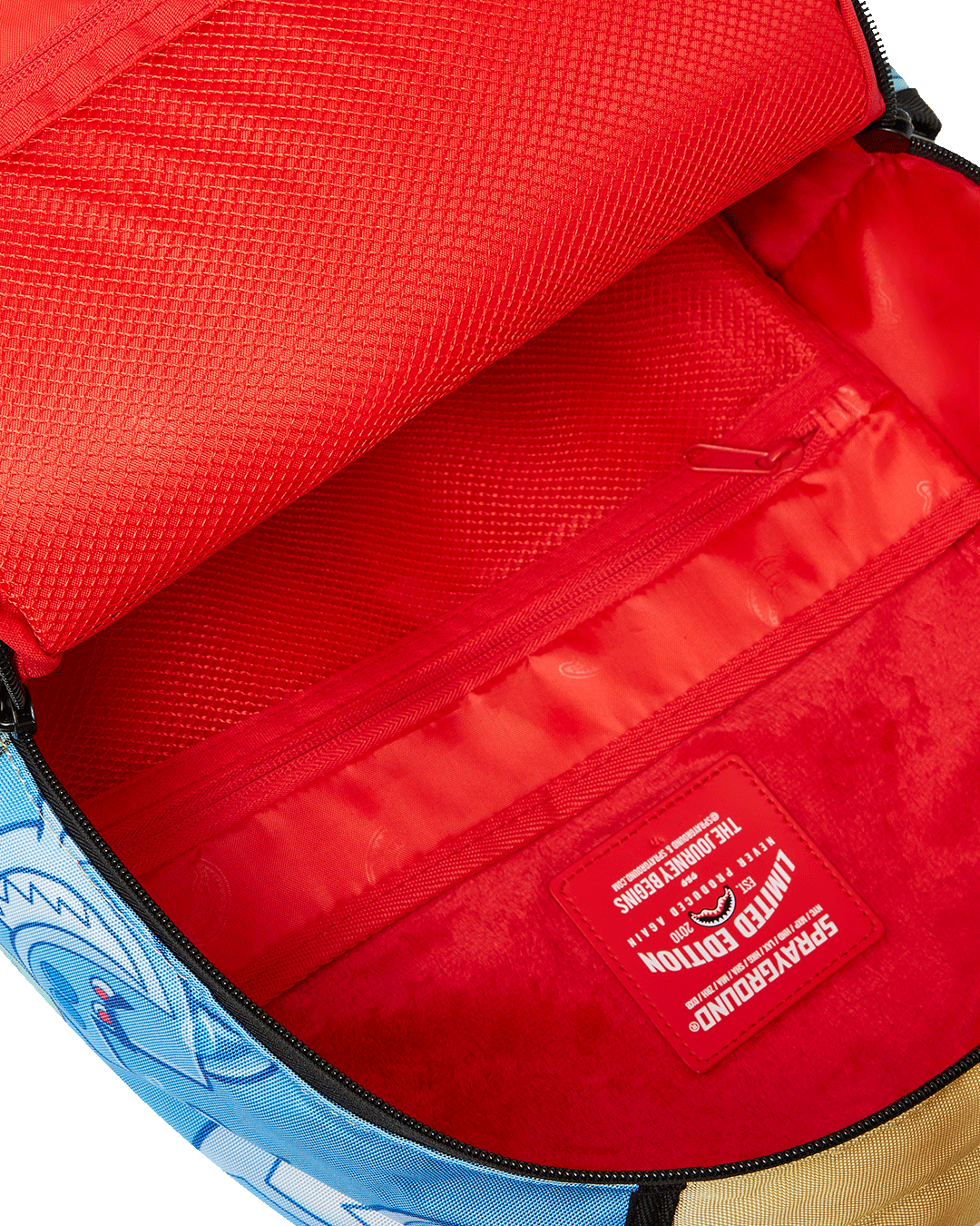 Dimensions: 18" x 6" x 11.5" • Front zipper pocket • Side pockets • Zippered Stash pocket • Separate velour sunglass compartment • Ergonomic mesh back padding • Adjustable Straps for custom sizing • Gold zippers with metal hardware • Metal "Sprayground Authentic" badge • Slide through back sleeve connects to carry-on luggage to free your hands