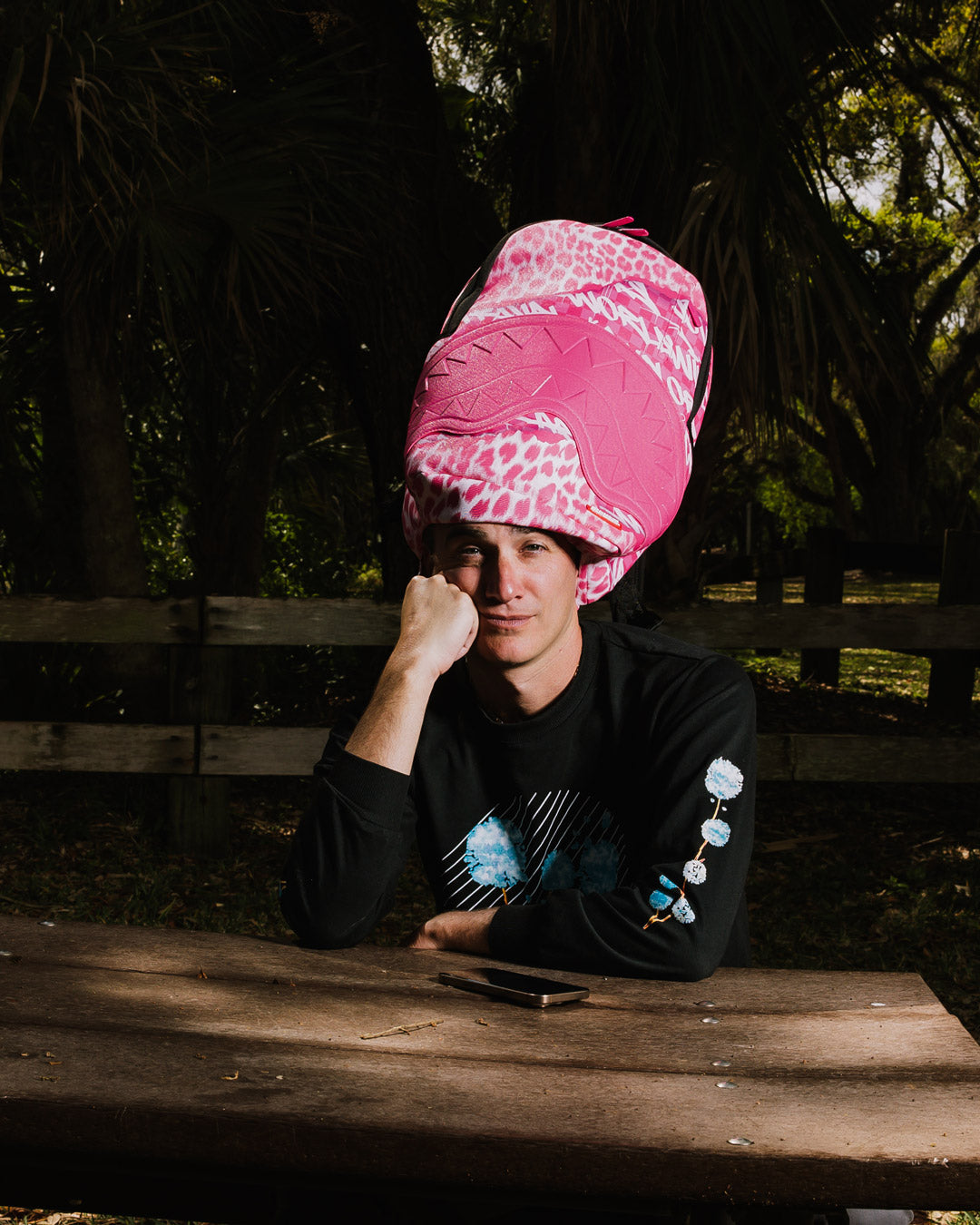 Dimensions: 18" x 6" x 11.5" • Front zipper pocket • Side pockets • Zippered Stash pocket • Separate velour sunglass compartment • Ergonomic mesh back padding • Adjustable Straps for custom sizing • Gold zippers with metal hardware • Metal "Sprayground Authentic" badge • Slide through back sleeve connects to carry-on luggage to free your hands
