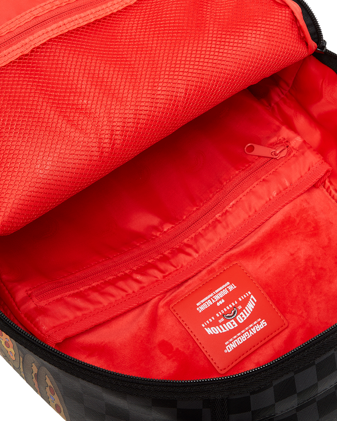 Dimensions: 18" x 6" x 11.5" • Front zipper pocket • Side pockets • Zippered Stash pocket • Separate velour sunglass compartment • Ergonomic mesh back padding • Adjustable Straps for custom sizing • Gold zippers with metal hardware • Metal "Sprayground Authentic" badge • Slide through back sleeve connects to carry-on luggage to free your hands