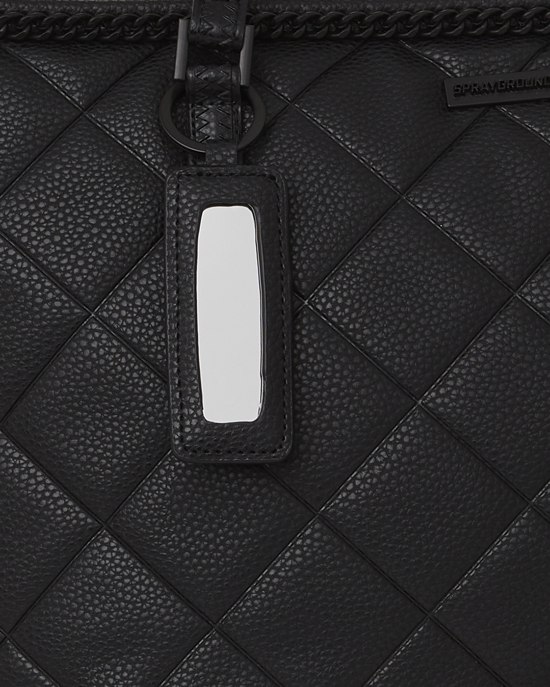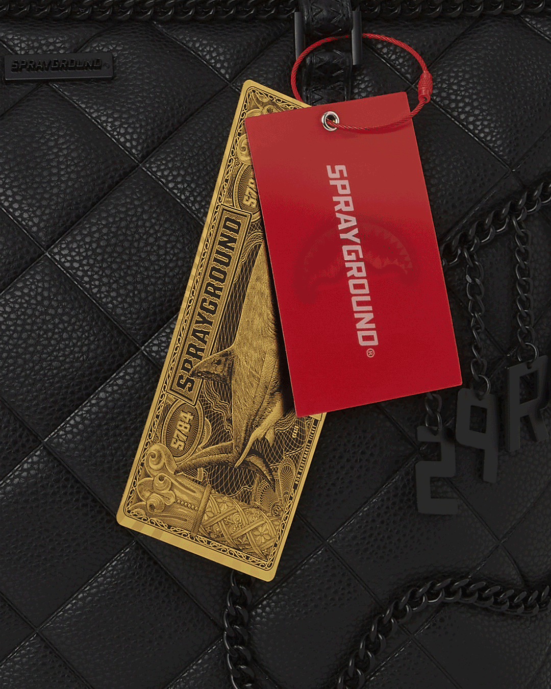 100% PVC quilted black faux leather featuring black chain hardware and hanging charm logo.