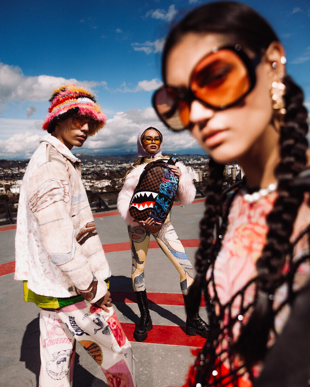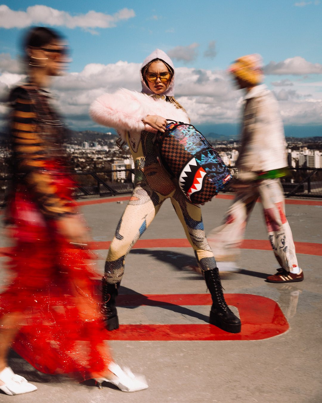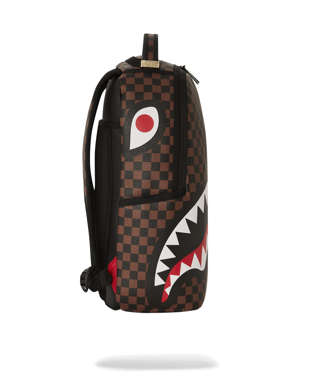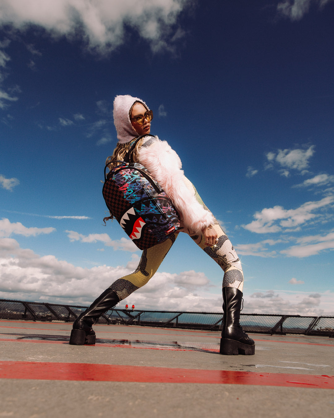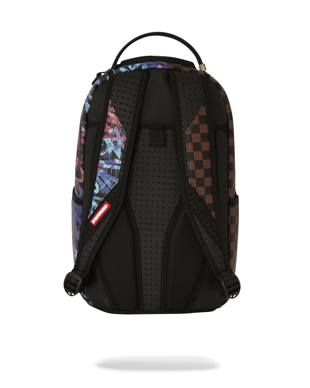 Dimensions: 18" x 6" x 11.5" • Front zipper pocket • Side pockets • Zippered Stash pocket • Separate velour sunglass compartment • Ergonomic mesh back padding • Adjustable Straps for custom sizing • Gold zippers with metal hardware • Metal "Sprayground Authentic" badge • Slide through back sleeve connects to carry-on luggage to free your hands
