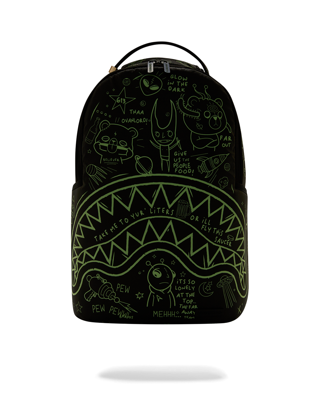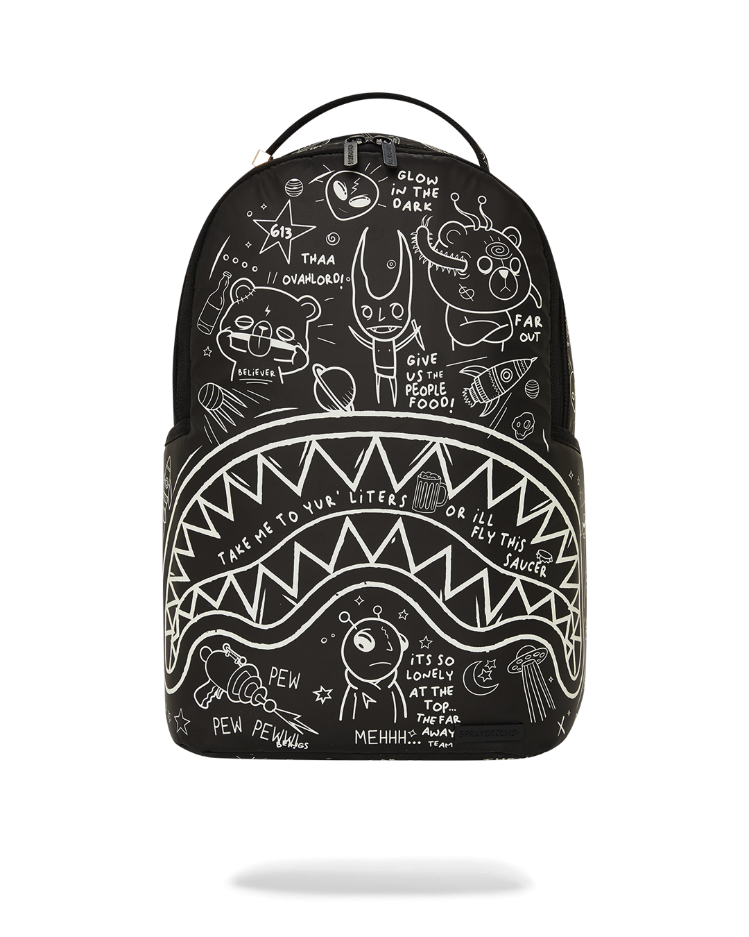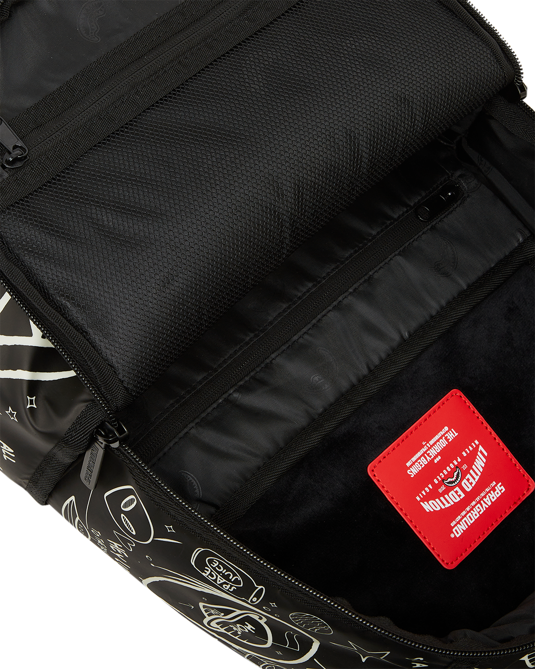 Dimensions: 18" x 6" x 11.5" • Front zipper pocket • Side pockets • Zippered Stash pocket • Separate velour sunglass compartment • Ergonomic mesh back padding • Adjustable Straps for custom sizing • Gold zippers with metal hardware • Metal "Sprayground Authentic" badge • Slide through back sleeve connects to carry-on luggage to free your hands