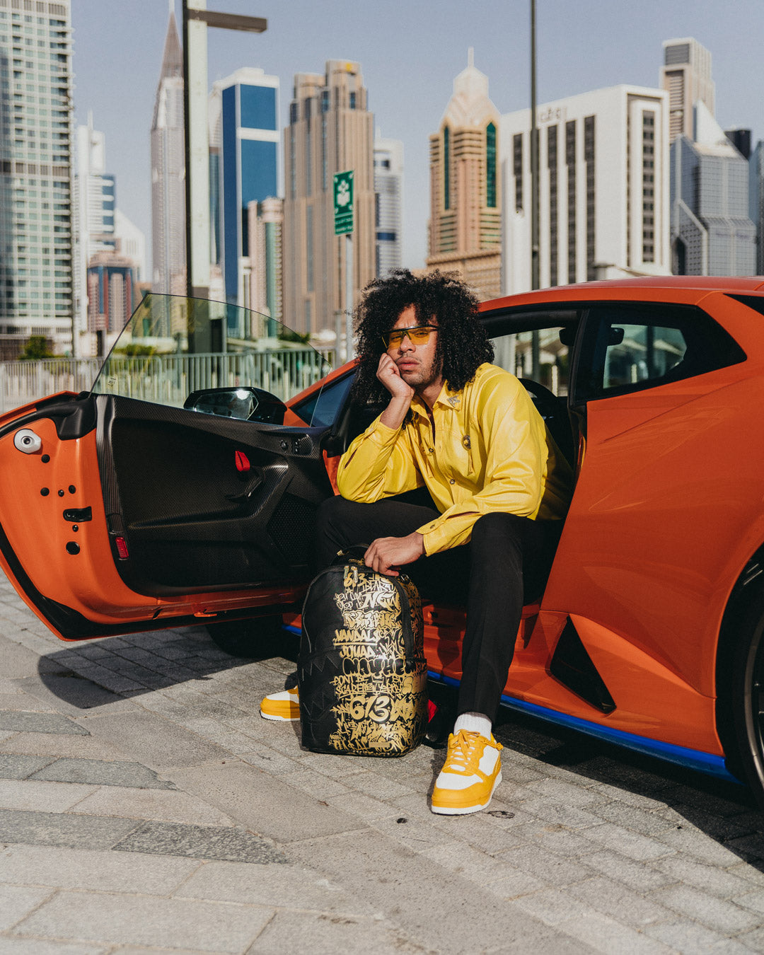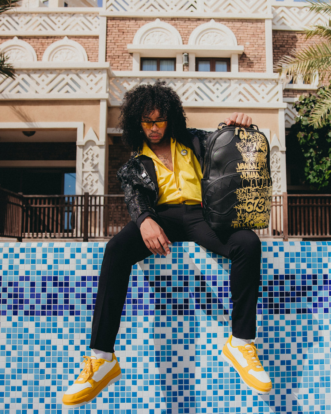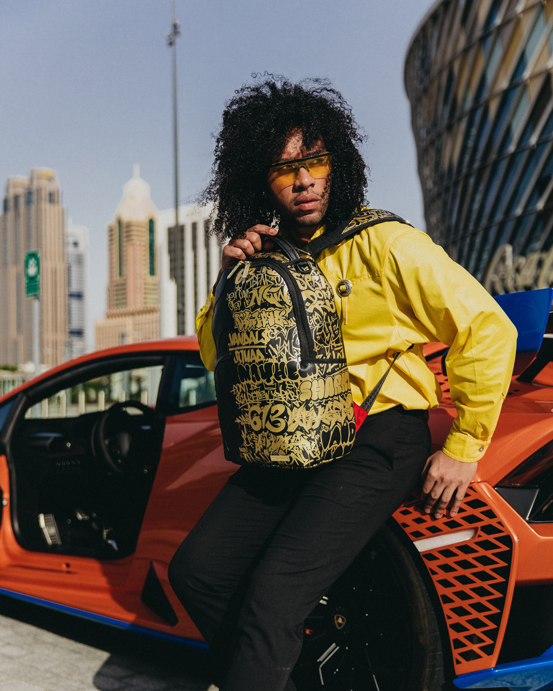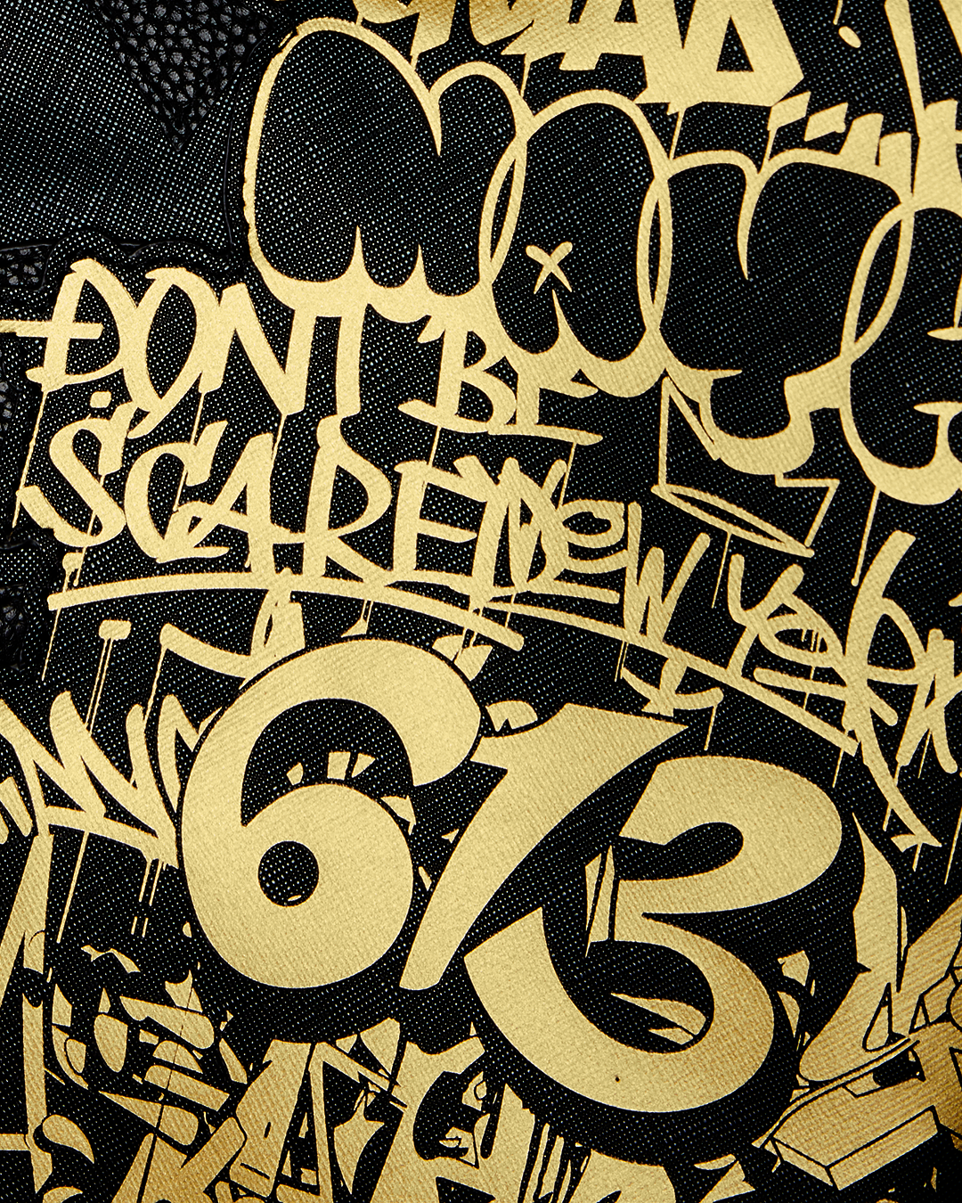 Dimensions: 18" x 6" x 11.5" • Front zipper pocket • Side pockets • Zippered Stash pocket • Separate velour sunglass compartment • Ergonomic mesh back padding • Adjustable Straps for custom sizing • Gold zippers with metal hardware • Metal "Sprayground Authentic" badge • Slide through back sleeve connects to carry-on luggage to free your hands