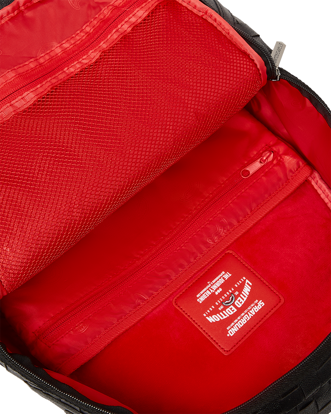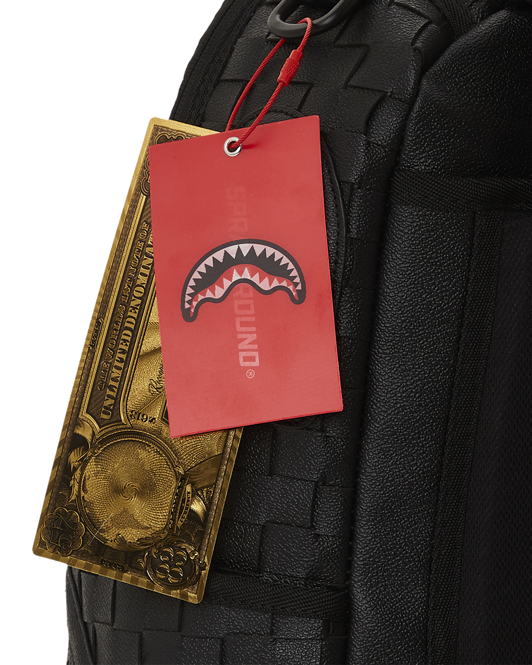 Dimensions: 18" x 6" x 11.5" • Front zipper pocket • Side pockets • Zippered Stash pocket • Separate velour sunglass compartment • Ergonomic mesh back padding • Adjustable Straps for custom sizing • Gold zippers with metal hardware • Metal "Sprayground Authentic" badge • Slide through back sleeve connects to carry-on luggage to free your hands