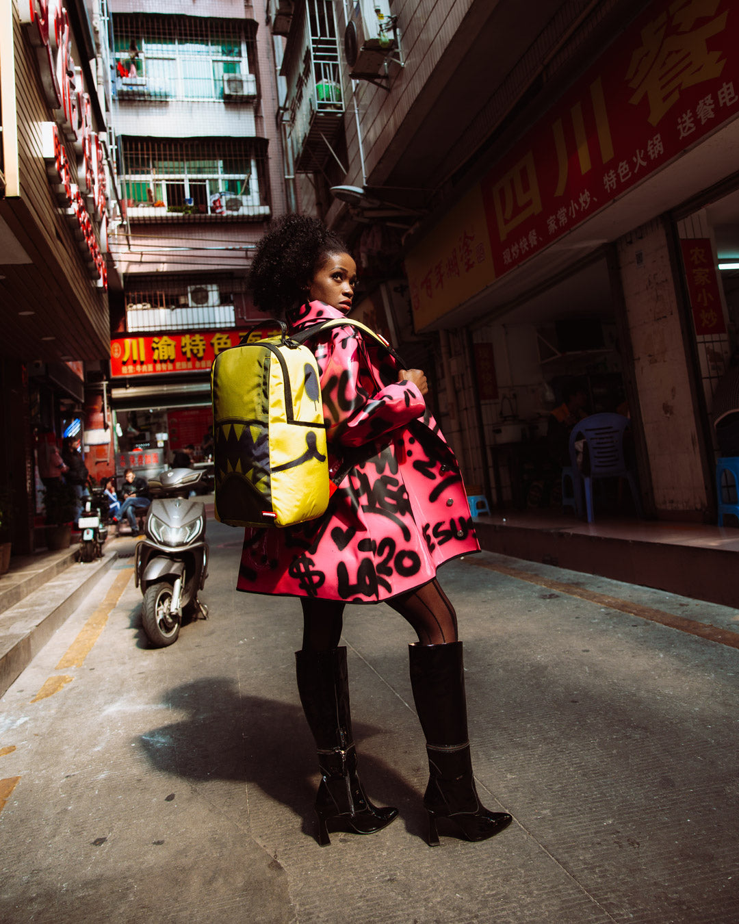 Dimensions: 18" x 6" x 11.5" • Front zipper pocket • Side pockets • Zippered Stash pocket • Separate velour sunglass compartment • Ergonomic mesh back padding • Adjustable Straps for custom sizing • Gold zippers with metal hardware • Metal "Sprayground Authentic" badge • Slide through back sleeve connects to carry-on luggage to free your hands