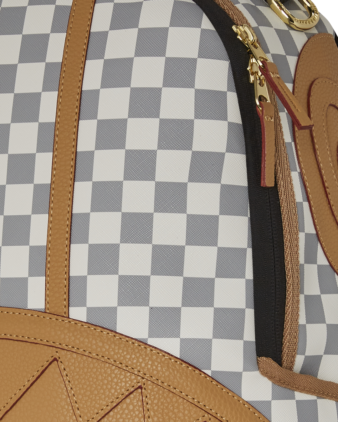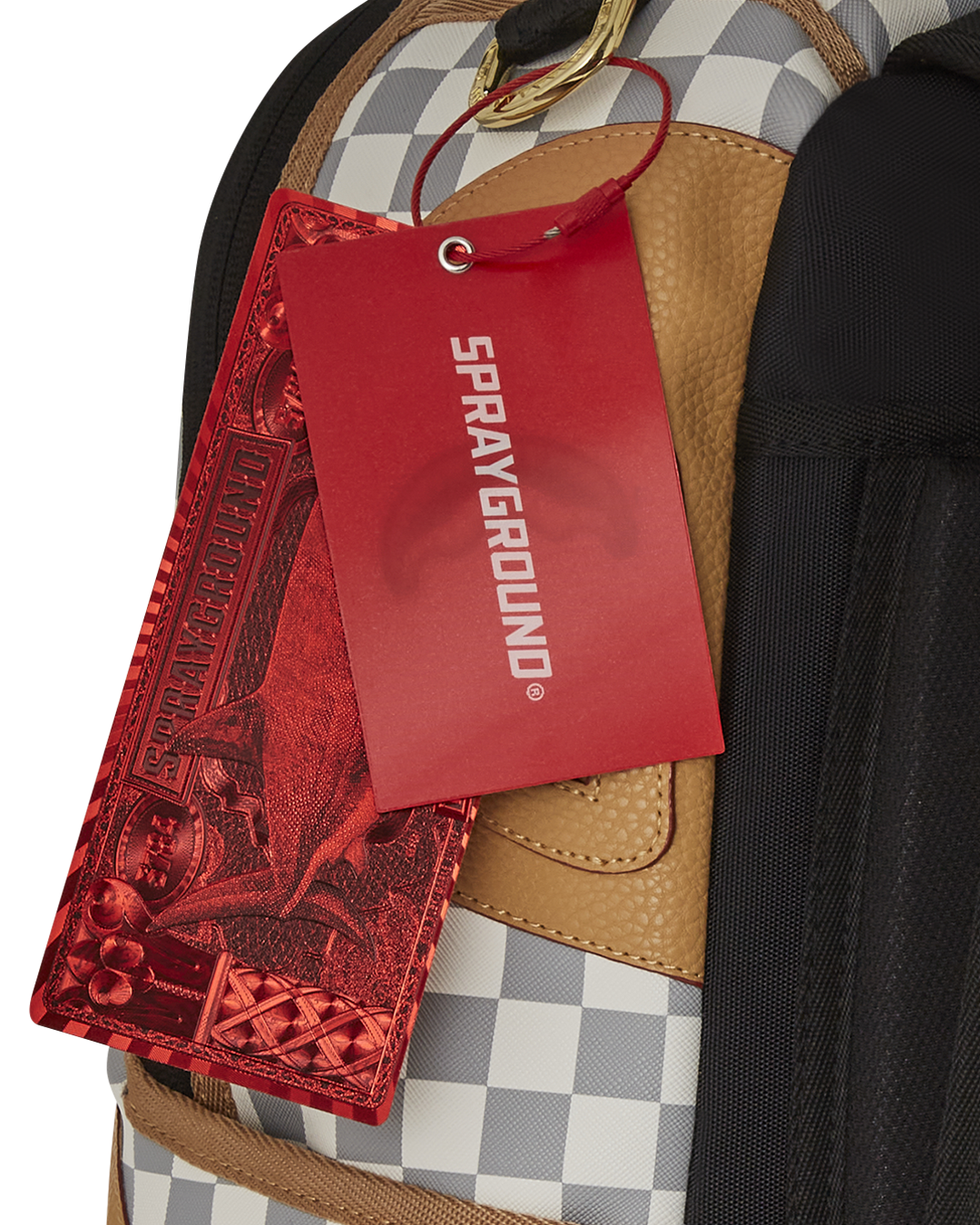 Dimensions: 18" x 6" x 11.5" • Front zipper pocket • Side pockets • Zippered Stash pocket • Separate velour sunglass compartment • Ergonomic mesh back padding • Adjustable Straps for custom sizing • Gold zippers with metal hardware • Metal "Sprayground Authentic" badge • Slide through back sleeve connects to carry-on luggage to free your hands
