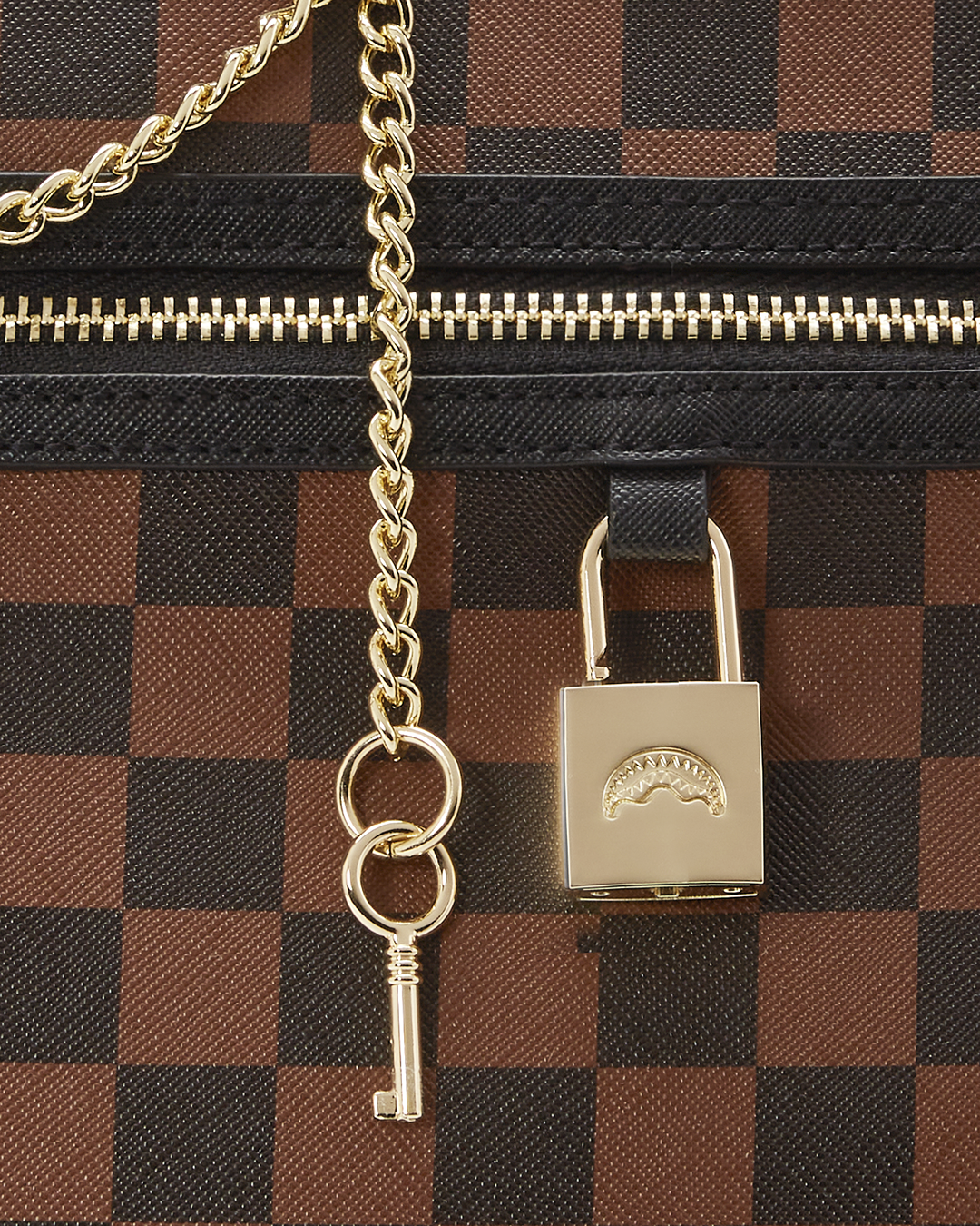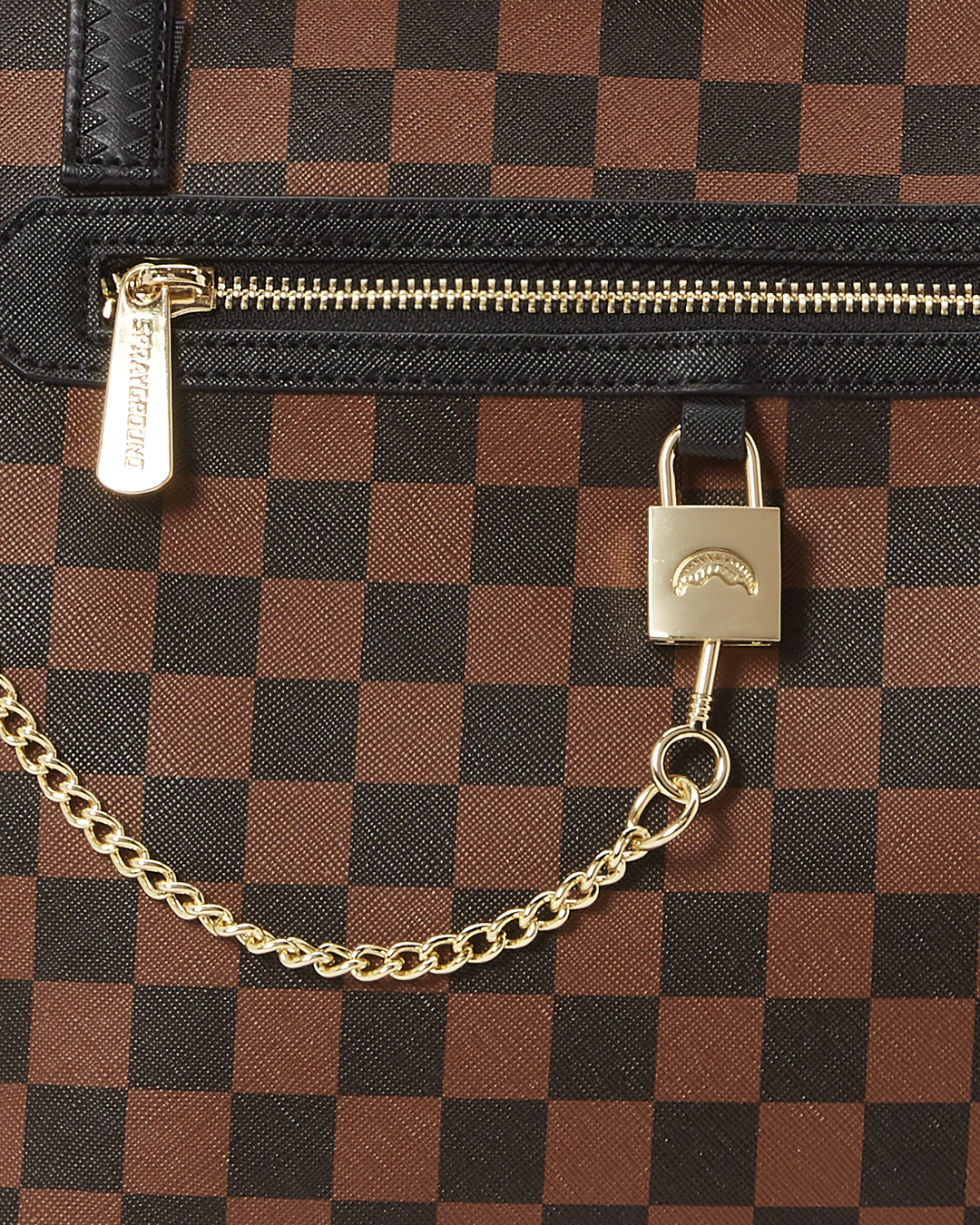 Dimensions: 19" x 6.5" x 11.5" • Top zipper opening • Top double handle • Sprayground keychain • Gold zippers with metal hardware