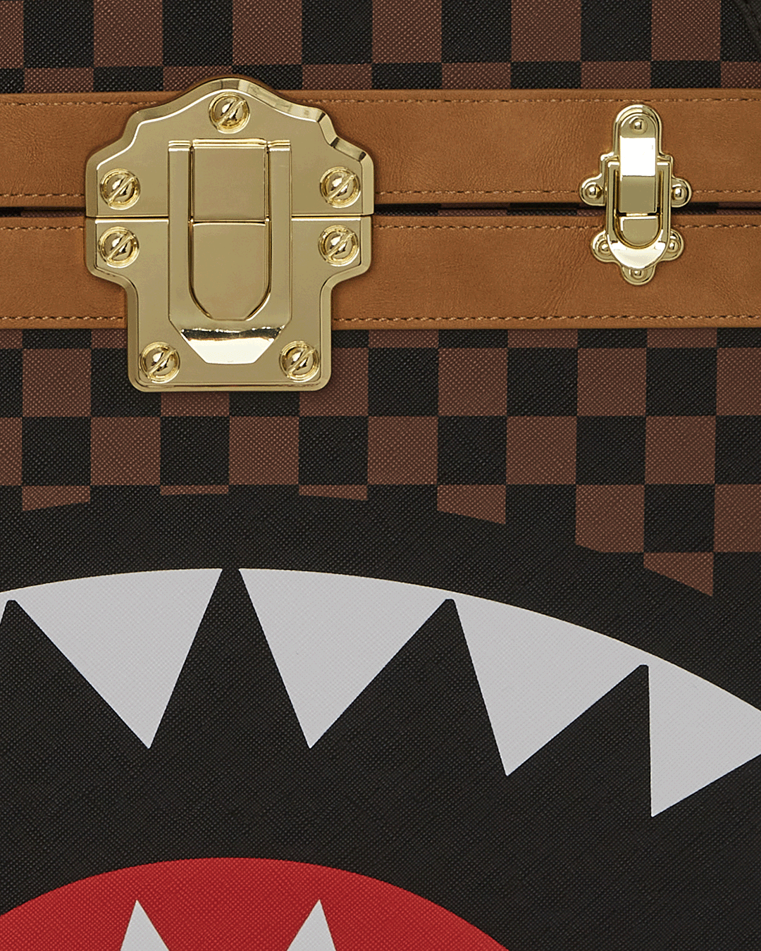 | Hard-shelled check PVC-lined trunk backpack. PVC leather applique detailing with embossed metal flat studs. PVC leather handle. Brass hardware including a brass lock. Three inner pockets for storage. |