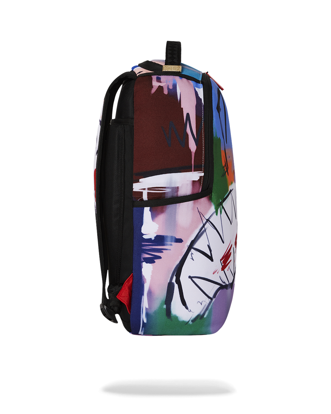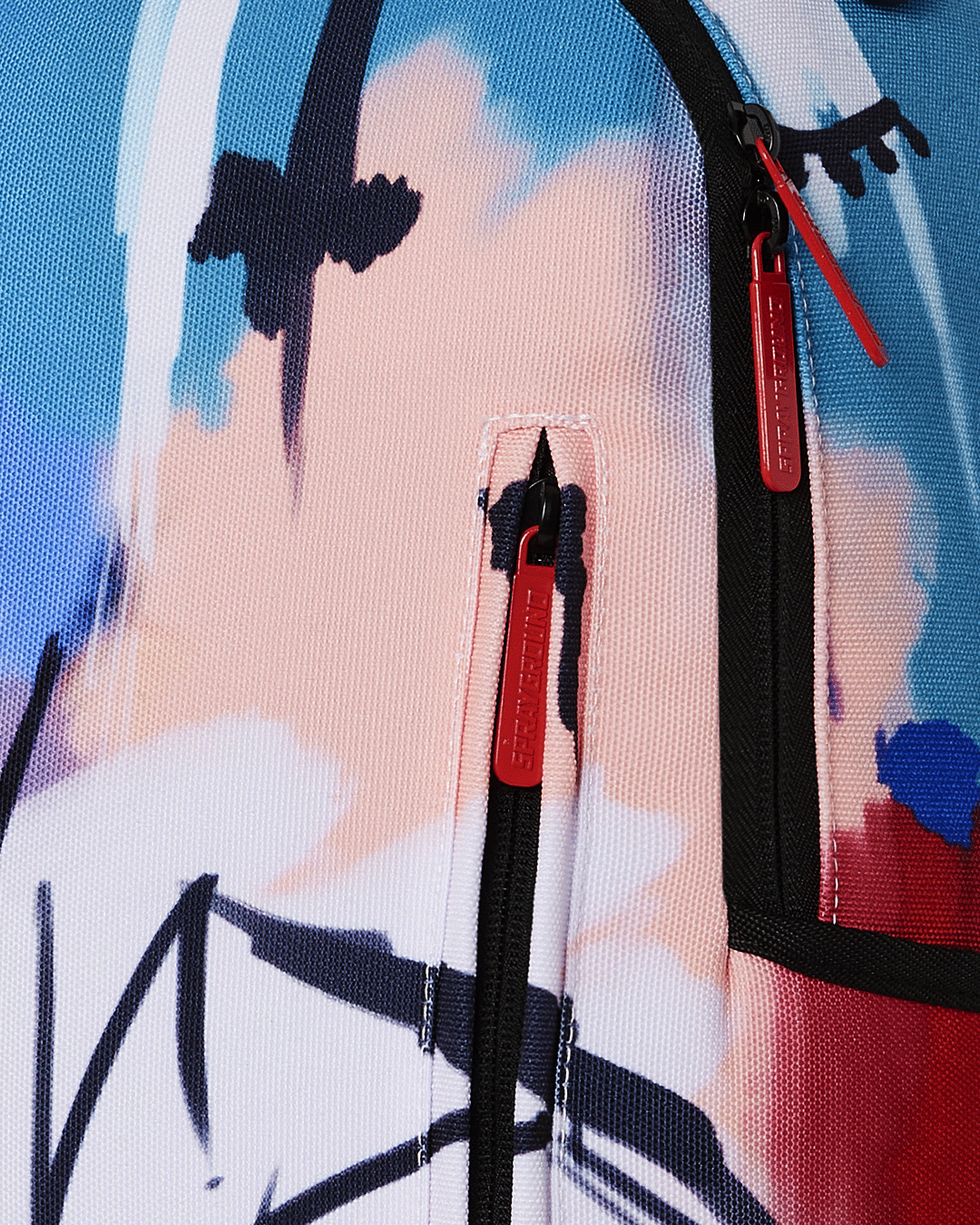 Dimensions: 18" x 6" x 11.5" • Front zipper pocket • Side pockets • Zippered Stash pocket • Separate velour sunglass compartment • Ergonomic mesh back padding • Adjustable Straps for custom sizing • Gold zippers with metal hardware • Metal "Sprayground Authentic" badge • Slide through back sleeve connects to carry-on luggage to free your hands