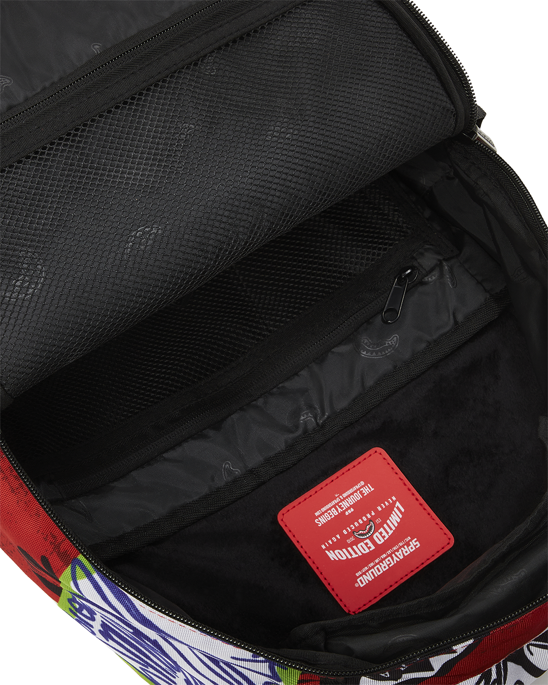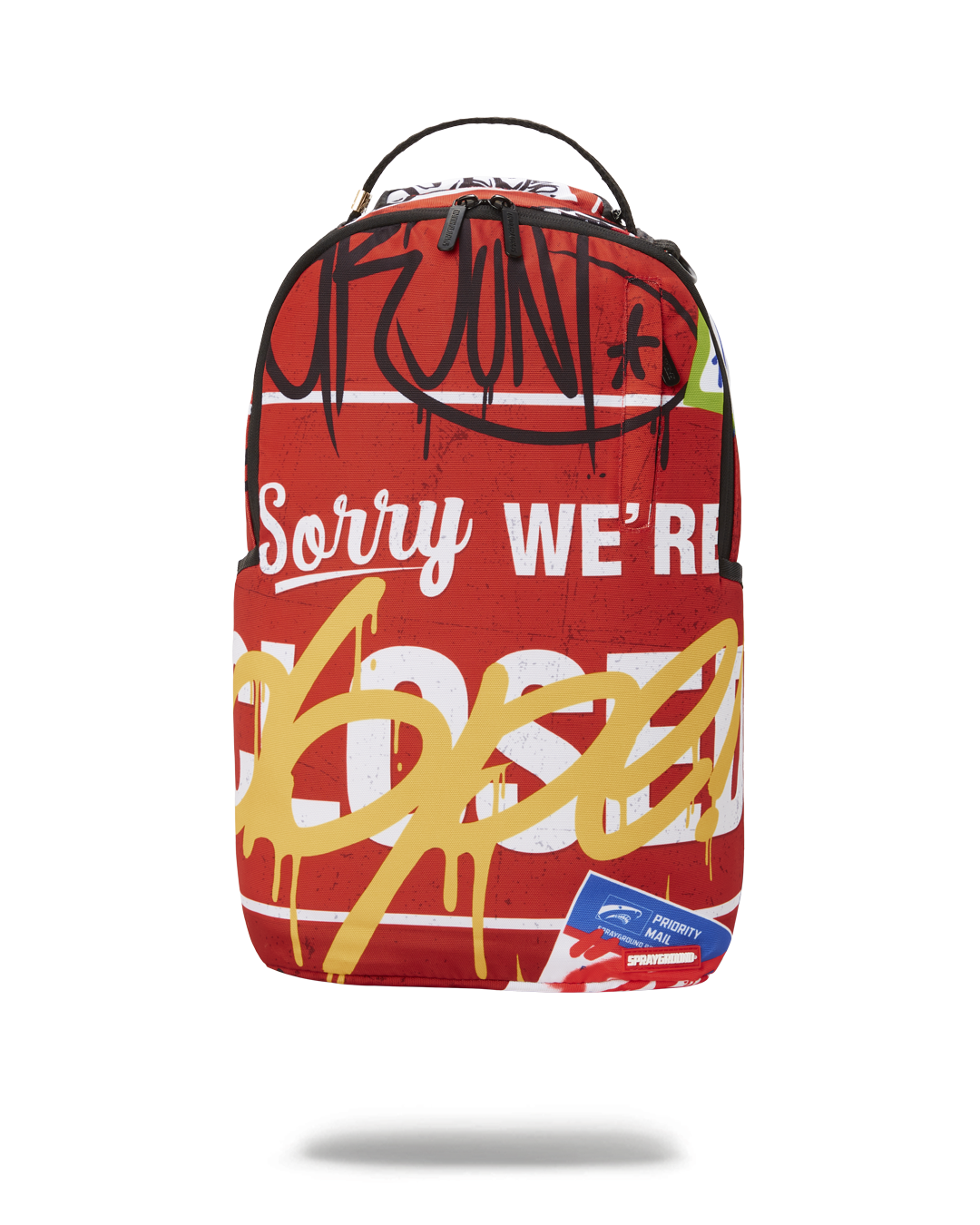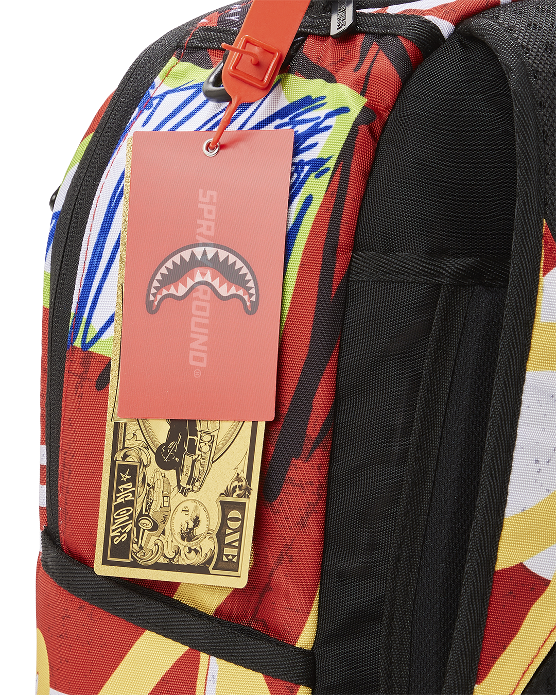 ExteriorDimensions: 18" x 6" x 11.5" • Front zipper pocket • Side pockets • Zippered Stash pocket • Separate velour sunglass compartment • Ergonomic mesh back padding • Adjustable Straps for custom sizing • Green zippers with metal hardware • Metal "Sprayground Authentic" badge • Slide through back sleeve connects to carry on luggage to free your hands