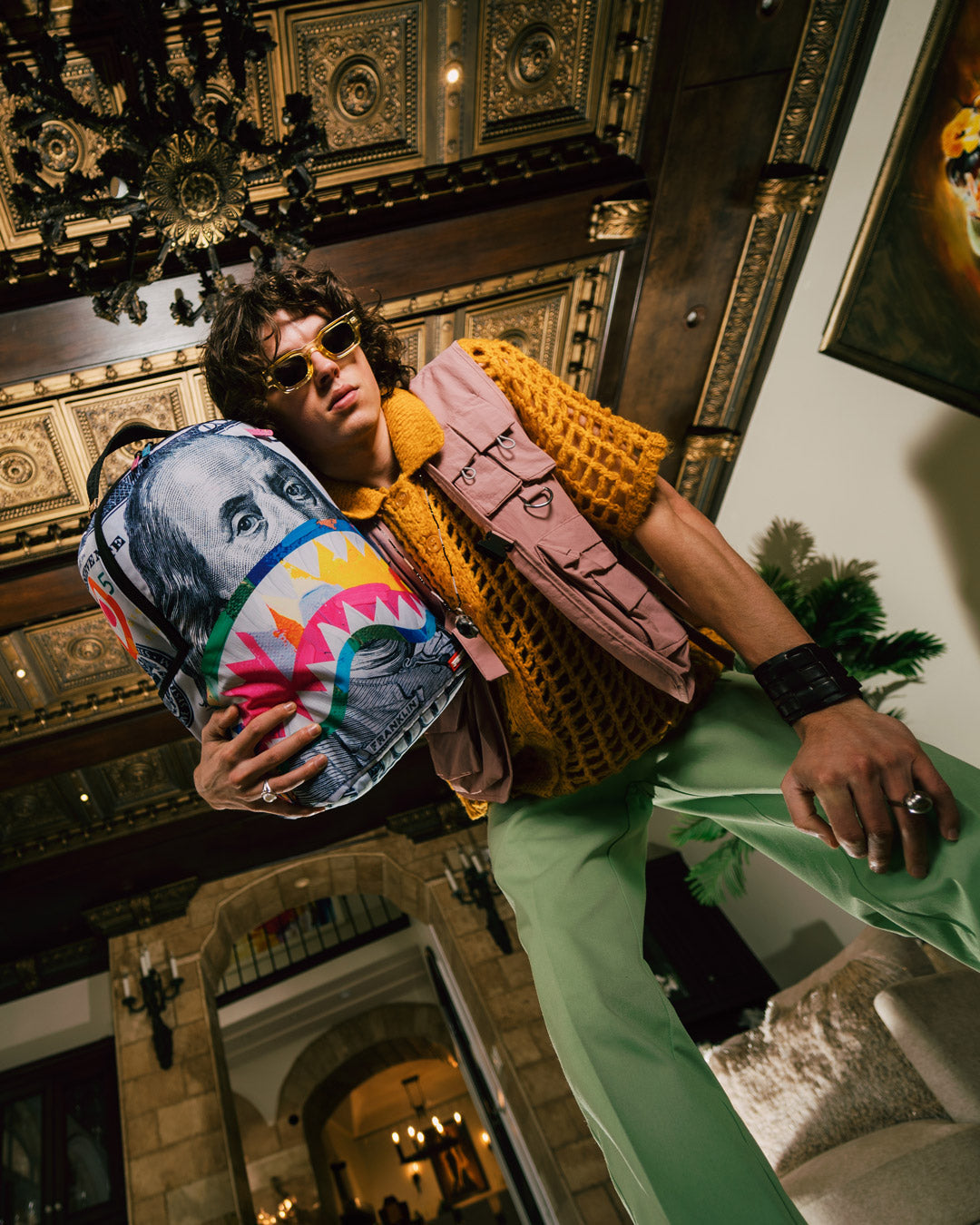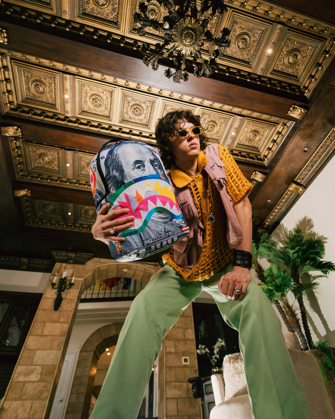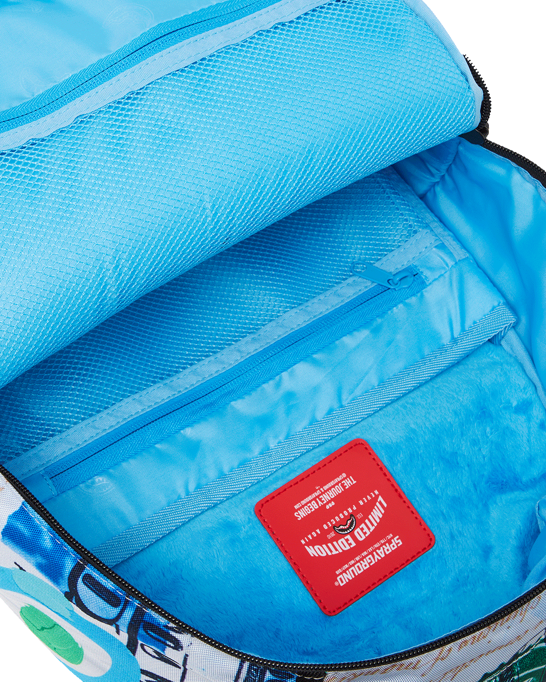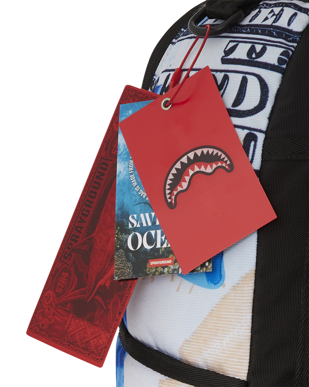 Dimensions: 18" x 6" x 11.5" • Front zipper pocket • Side pockets • Zippered Stash pocket • Separate velour sunglass compartment • Ergonomic mesh back padding • Adjustable Straps for custom sizing • Gold zippers with metal hardware • Metal "Sprayground Authentic" badge • Slide through back sleeve connects to carry-on luggage to free your hands