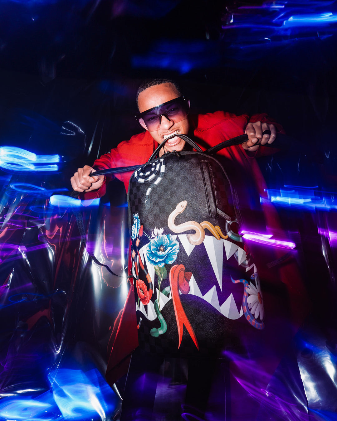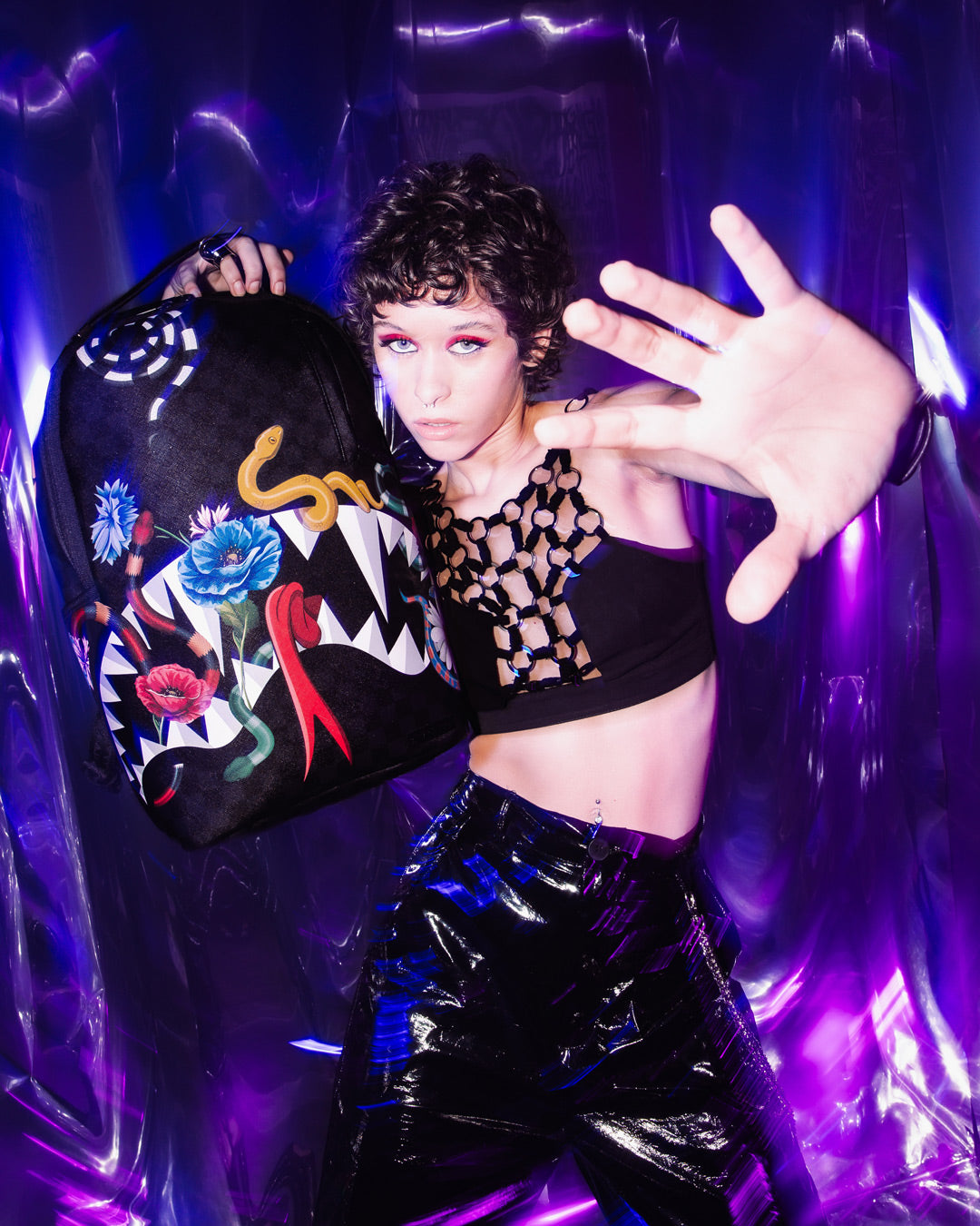 Dimensions: 18" x 6" x 11.5" • Front zipper pocket • Side pockets • Zippered Stash pocket • Separate velour sunglass compartment • Ergonomic mesh back padding • Adjustable Straps for custom sizing • Gold zippers with metal hardware • Metal "Sprayground Authentic" badge • Slide through back sleeve connects to carry-on luggage to free your hands