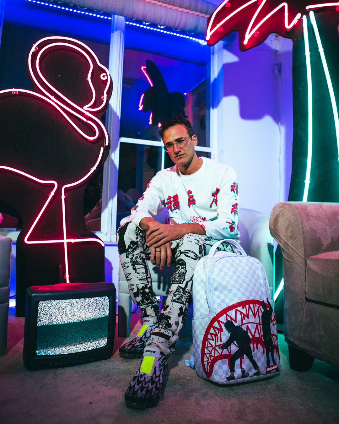 Dimensions: 18" x 6" x 11.5" • Front zipper pocket • Side pockets • Zippered Stash pocket • Separate velour sunglass compartment • Ergonomic mesh back padding • Adjustable Straps for custom sizing • Gold zippers with metal hardware • Metal "Sprayground Authentic" badge • Slide through back sleeve connects to carry-on luggage to free your hands